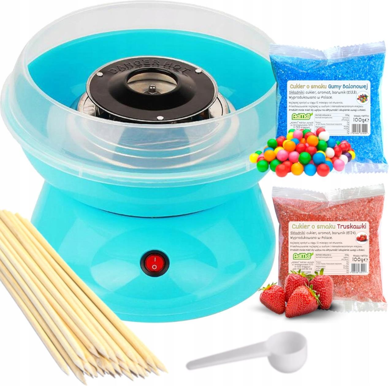 Domowa Maszyna do Waty Cukrowej Maszynka do Robienia Waty + Cukier 2x 100g Maszyna do Waty Cukrowej Witaj! Pragniemy przedstawić naszą ofertę - domową maszynę do waty cukrowej w kolorze niebieskim. Do maszyny standardowo dołączone są: patyczki (w formie wykałaczek), miarka. Od siebie dodajemy również: 2 saszetki cukrów po 100g: niebieski o smaku gumy balonowej, czerwony/różowy o smaku truskawki. W naszych pozostałych ofertach znajdziesz większe zestawy, cukry, patyczki oraz wiele innych różności. Krótka instrukcja użytkowania nakładamy misę z osłonką oraz głowicę znajdującą się na spodzie urządzenia (uwaga na dopasowanie do specjalnego wycięcia) wsypujemy cukier do głowicy (nie przepełniać) włączamy maszynę (głowica się kręci i podgrzewa) po kilku minutach cukier karmelizuje się, w tej postaci wylatuje z kręcącej się głowicy i pod wpływem chłodu powietrza robią się z niego nitki waty, które nawijamy na patyk czekamy, aż wata przestanie się pojawiać i wyłączamy maszynę smacznego! Dane techniczne maszyny: Czas przygotowania waty: 3-4 minuty Średnica misy: 25 cm Moc: 450W Zasilanie: 220-240V, częstotliwość 50/60Hz Wymiary: 25 x 25 x 17 cm Waga z opakowaniem: 1,25 kg Kolor: niebieski dołączona instrukcja obsługi Kilka cennych uwag: (przed zakupem prosimy o zapoznanie się z nimi) Maszynka nie jest profesjonalnym sprzętem. Jest mała i zaprojektowana z myślą o dzieciach i ich bezpieczeństwie, więc jej wydajność nie jest porównywalna np. z maszynami z festynów. Pozwala na zrobienie tylko małych watek w warunkach domowych. Wata zaczyna pojawiać się dopiero po kilku minutach w dość wolnym tempie. Podczas produkcji oprócz waty zawsze powstaje też "odpad cukierkowy". Osadza się na misie i osłonce, czasem cukierki mogą się odbić i wylecieć poza maszynę. Maszynka nie jest zaprojektowana do pracy ciągłej, po kilku zrobionych watkach warto dać jej odpocząć, a nawet wyczyścić/umyć, jeśli powstało dużo odpadu. W przeciwnym wypadku każda kolejna watka może powstawać z coraz mniejszą wydajnością. Głowiczki w tych maszynkach nie są idealnie wyważone, przez co przy ruchu obrotowym cała maszynka może delikatnie wibrować. Pod głowiczką są 2 grzałki i blaszka, jeśli cukier przypadkiem trafi na te rozgrzane elementy, może się na nich bardzo szybko spalić. Należy więc z dużą starannością wsypywać cukier tylko do głowicy przy wyłączonej maszynie. Czarny spalony cukier będący na grzałkach oraz blaszce świadczy o nieprawidłowym użytkowaniu sprzętu. Nie należy wyłączać maszynki w trakcie produkcji waty, można to zrobić dopiero, gdy przestanie się ona pojawiać, czyli głowiczka będzie pusta, bez cukru. Inaczej może on w jej wnętrzu przypalić się. Chcąc zachować czystość maszyny po jej pracy wystarczy jej zdjęte elementy (głowicę, misę, osłonę) opłukać ciepłą wodą do momentu rozpuszczenia drobinek cukru/karmelu. Uwaga na gorącą głowicę i grzałki bezpośrednio po pracy urządzenia! Cukry dołączone do maszyny (na oddzielnych aukcjach można dokupić także inne warianty cukrów (inna waga, smaki))