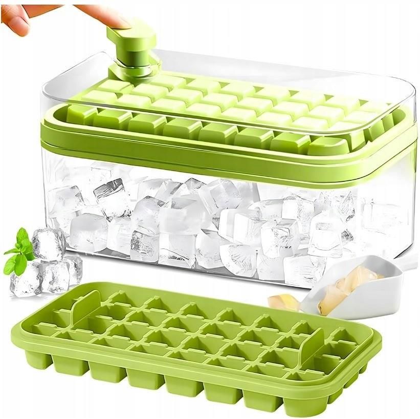 DUŻY POJEMNIK DO ROBIENIA KOSTEK LODU FOREMKA NA LÓD KOSTKARKA 64 SZT XXL Pojemnik na lód z 64 kostkami i szufelką to niezbędnik każdej udanej imprezy! Dzięki dużej pojemności, nigdy nie zabraknie Ci lodu na chłodne napoje. Wykonany z wysokiej jakości materiałów, zapewnia trwałość i łatwość w utrzymaniu czystości. Szufelka ułatwia szybkie i wygodne serwowanie lodu. Dodaj odrobinę luksusu do swojego domu i ciesz się idealnie schłodzonymi drinkami w każdej chwili! Dlaczego warto kupić pojemnik na lód Duża pojemność: Mieści aż 64 kostki lodu, co jest idealne na większe spotkania i imprezy. Wbudowane miejsce do przechowywania: Umożliwia wygodne przechowywanie lodu, zapewniając, że zawsze będziesz mieć go pod ręką. Łopatka w zestawie: Ułatwia szybkie i higieniczne serwowanie lodu bez konieczności dotykania kostek rękami. Wysokiej jakości materiały: Wykonany z trwałych i łatwych do czyszczenia materiałów, co zapewnia długowieczność produktu. Stylowy design: Elegancki wygląd pojemnika dodaje uroku każdej kuchni i doskonale prezentuje się na każdej imprezie. Specyfikacja Wymiary: 24 x 14 x 11 cm Kolor: zielony i transparentny Elementy zestawu: pojemnik na lód, 2 tacki na kostki lodu i szufelka AŻ 64 MIEJSC NA KOSTKI LODU INSTRUKCJA Wypełnij formy do lodu wodą. Włóż pojemnik do zamrażalnika. Wyjmij tace na kostki lodu. Umieść jedną tacę na kostki lodu na odwrót i przykryj pokrywkę( zwróć uwagę, żeby przycisk od pokrywki był w narożniku gdzie jest ucięty narożnik) Dociśnij przycisk, a z formy wypadnie lód. Dodaj kostki lodu do szklanki za pomocą łopatki, mrożony napój jest gotowy. Pojemnika nie należy myć w zmywarce.