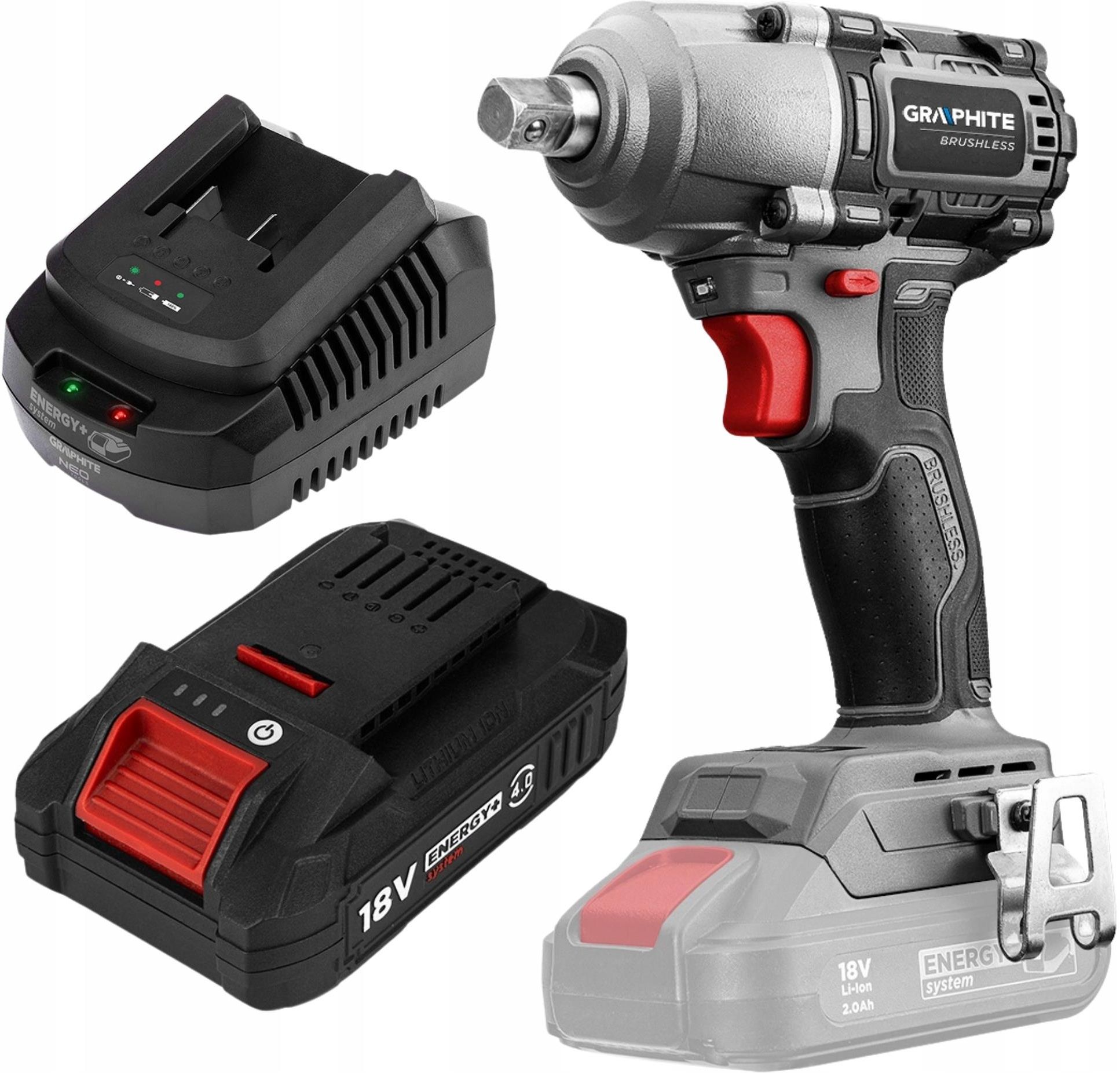 GRAPHITE Klucz Udarowy Bezszczotkowy Akumulatorowy 450Nm Energy + Akumulator 4.0Ah + Ładowarka Zestaw zawiera Klucz udarowy bezszczotkowy 450Nm Energy+, GRAPHITE 58g038 Akumulator Energy+ 18V, Li-Ion 4.0Ah BOOST UP GRAPHITE Ładowarka do akumulatorów Energy+ GRAPHITE 1. GRAPHITE Klucz Udarowy …
