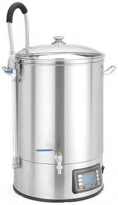 Kocioł warzelny do piwa 60 l, nr kat. 289969, do przygotowania domowego piwa, Hendi. Cechy produktu: Kocioł warzelny jest przeznaczony do przygotowania piwa ze słodu w warunkach domowych. Doskonała propozycja dla domowych piwowarów, miłośników własnych i odważnych receptur oraz poszukiwaczy smaków. Profesjonalny i jednocześnie łatwy w obsłudze sprzęt z obudową ze stali nierdzewnej AISI 304 Tryb ręczny dla specjalistów warzących piwo wg własnej fantazji. Tryb pracy automatycznej- pamięć urządzenia pozwala zapisać 9 receptur, każdą do 9 kroków. Intuicyjny panel sterowania z cyfrowym wyświetlaczem parametrów pracy. Zakres temperatury grzania: od 25°C do 100°C, z dokładnością do 0,1°C. Pompa zapewnia płynne i efektywne mieszanie zacieru. Podziałka wewnątrz zbiornika ze skalą co 5 l i zewnętrzny wskaźnik w postaci szklanej rurki ze skalą co 1 l ułatwiają kontrolę poziomu napełnienia naczynia. Obudowa ze stali nierdzewnej AISI 304 Dno oddziela komorę fermentacyjną od pompy i sekcji sterowania ze stali AISI 304 Wyposażony w kran spustowy Pokrywa kotła została wykonana ze szkła hartowanego. Dane techniczne: Marka: HENDI Zakres temperatur (°C): 25-100 Element grzewczy: Grzałka Napięcie V: 230 Wysokość mm: 780 Moc wejściowa W: 3000 Średnica mm: 400 Maksymalna objętość l: 60