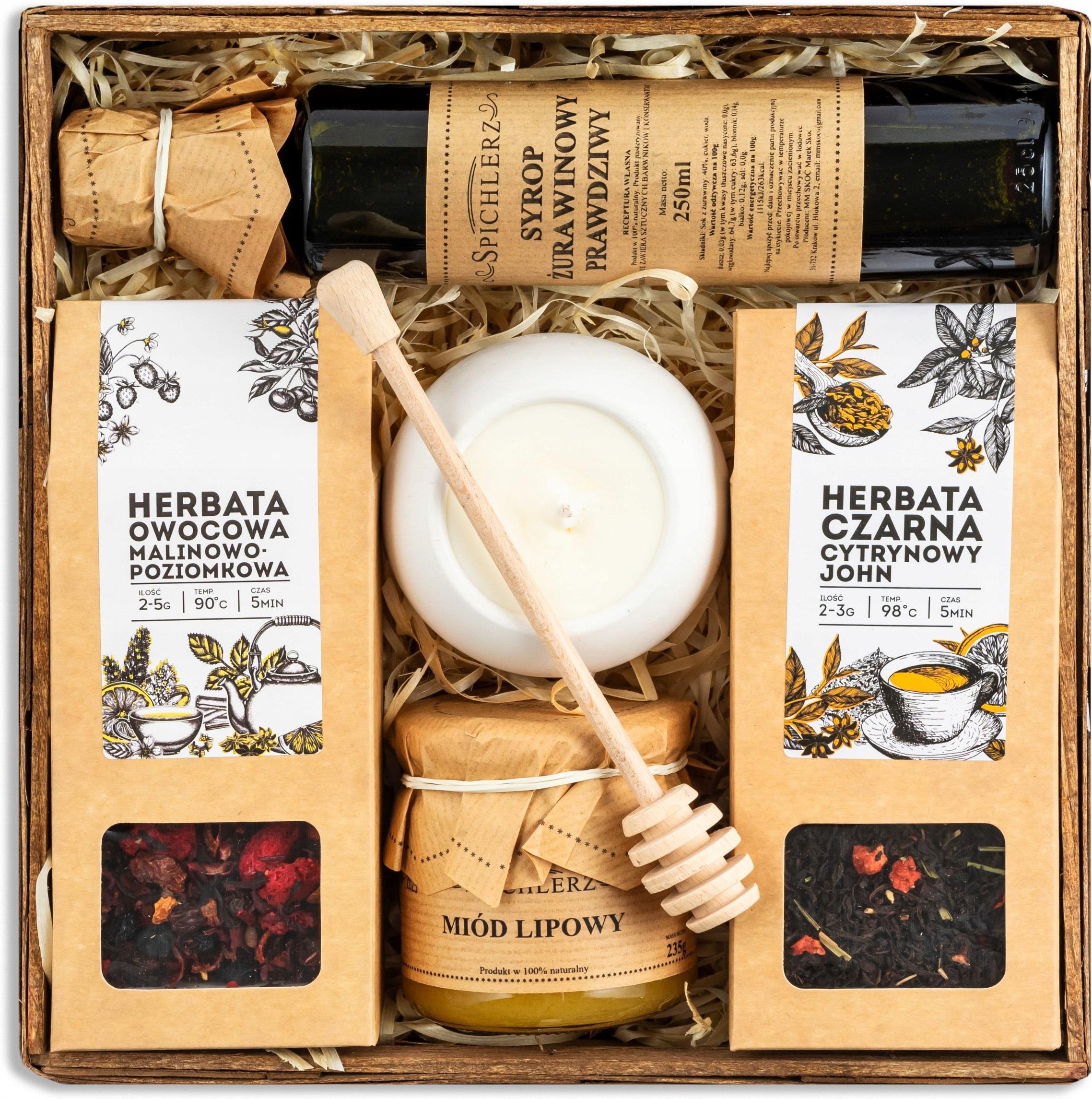 KOSZ PREZENTOWY miód HERBATA PREZENT Prezent zawiera Herbata owocowa Malinowo-Poziomkowa 50g. Charakteryzuje się ona bogatym, słodkim smakiem z delikatnymi nutami kwaskowymi. Herbata czarna Cytrynowy John 50g. Syrop żurawinowy 250 ml (315g) Miód lipowy 235g. Miód z Polskiej pasiki. Świeca sojowa w formie gipsowej. Forma robiona ręcznie. Nabierak do miodu. Koszyk pleciony z łuby sosnowej. Wypełnienie w postaci wełny drewnianej. Prezent zapakowany. Specyfikacja opakowania pudełko prezentowe naturalne produkty PRODUKT POLSKI całość jest zafoliowana *możliwość dołączenia kartki prezentowej (czytaj niżej) Wymiary prezentu długość: 25 cm szerokość: 25 cm wysokość: 8 cm Sposób pakowania naszych herbat Herbaty marki Jedwabny szlak konfekcjonowane na precyzyjnych maszynach do produkcji herbat. Na etykiecie znajduje się sposób parzenia herbaty. Herbata hermetycznie zamknięta co sprawia, że po otwarciu jest świeża i aromatyczna. Opcję dodatkową realizujemy już w koszyku i jest ona dodatkowo płatna. kratka jest wkładana w zestaw niepowtarzalny nadruk na froncie kartki napis "Prezent na szczególną okazję" dowolny tekst wewnątrz można wysłać bezpośrednio do obdarowanej osoby * Przykładowy wygląd naszych zestawów poniżej.