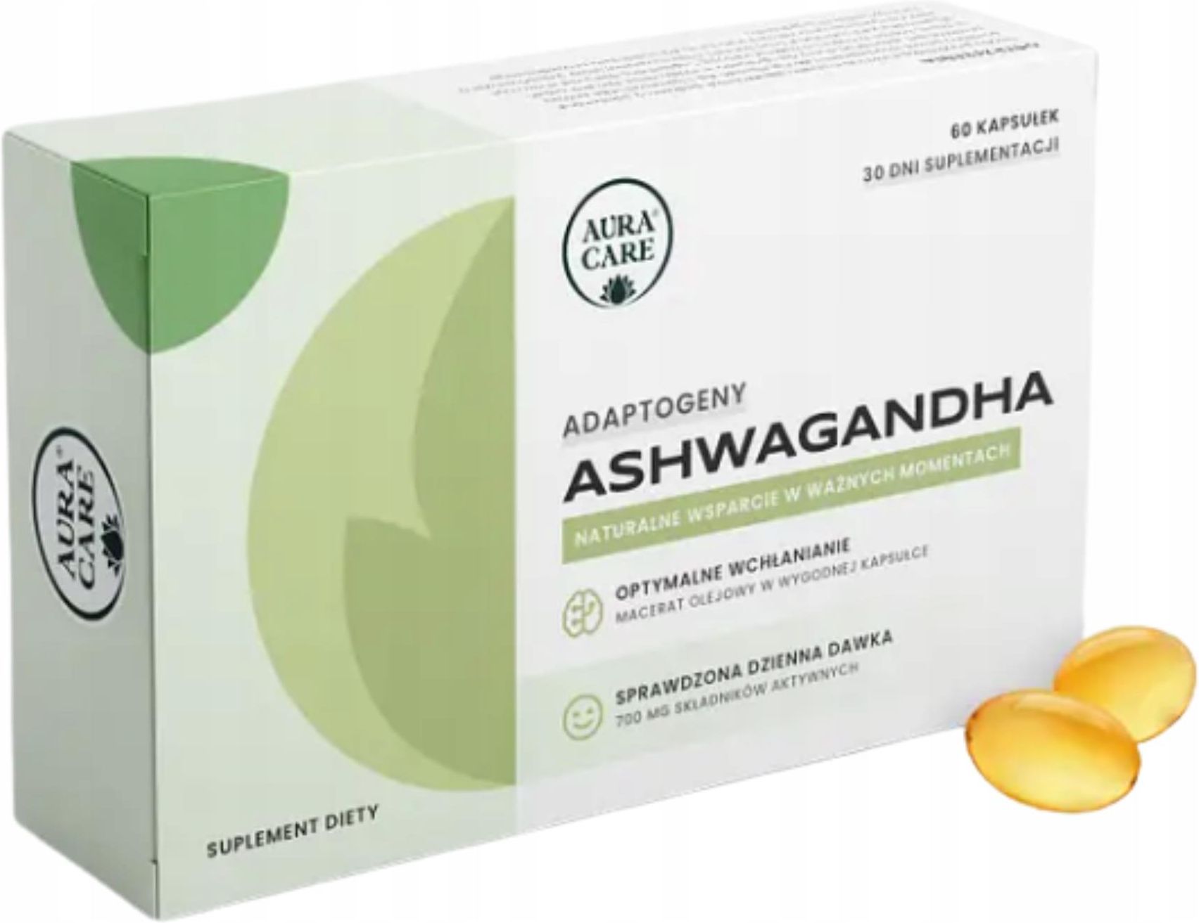 Aura Care Ashwagandha – kapsułki na stres i równowagę | 60 szt Ashwagandha – Adaptogen w kapsułkach żelowych Aura Care Spokój. Energia. Równowaga – w wygodnej formie kapsułki. Ashwagandha (Withania somnifera) to adaptogen o udowodnionym działaniu, od wieków stosowany w celu wzmocnienia organizmu i zwiększenia odporności na stres. W dzisiejszym świecie, gdzie większość z nas funkcjonuje z przebodźcowanym układem nerwowym i w ciągłym napięciu, jej właściwości są bardziej potrzebne niż kiedykolwiek. Dlatego stworzyliśmy Ashwagandhę w kapsułkach żelowych – wygodną w stosowaniu, precyzyjnie dozowaną i gotową do codziennej suplementacji, aby w prosty sposób wspierać Twój spokój, energię i równowagę. Aura Care – Ashwagandha w kapsułkach żelowych Korzyści ze stosowania Udostępniamy szczegółowe informacje na temat każdego składnika, zgodnie z dokumentacją dotyczącą oświadczeń zdrowotnych wydanych przez Europejski Urząd ds. Bezpieczeństwa Żywności (EFSA). Te oświadczenia zostały opracowane na podstawie rygorystycznych analiz naukowych, aby zapewnić pełną transparentność i wiarygodność w kontekście wpływu poszczególnych substancji na zdrowie. Zarządzanie stresem i napięciem: Ashwagandha jest znana ze swoich właściwości adaptogennych, które pomagają organizmowi radzić sobie ze stresem i napięciem. Wzrost poziomu stresu jest częstym zjawiskiem w dzisiejszym życiu, a Ashwagandha może być pomocna w regulacji reakcji organizmu na stres, poprawiając jego zdolność do adaptacji. Poprawa zdrowia psychicznego: Współczesny styl życia często niesie ze sobą wyzwania związane ze zdrowiem psychicznym, takie jak napięcie nerwowe, lęk czy depresja. Ashwagandha może wspierać zdrowie psychiczne poprzez łagodzenie objawów napięcia nerwowego, redukcję lęku i poprawę nastroju. Regulacja snu: Wzrost problemów związanych ze snem jest powszechnym problemem we współczesnym społeczeństwie. Ashwagandha może pomóc w poprawie jakości snu i regulacji rytmu snu, co przyczynia się do lepszego wypoczynku i regeneracji organizmu. Wzmacnianie układu odpornościowego: Odporność jest kluczowa dla zdrowia i dobrego samopoczucia, zwłaszcza w obliczu obecnej sytuacji zdrowotnej. Ashwagandha może wspomagać układ odpornościowy, wzmacniając naturalne mechanizmy obronne organizmu. Energia i wytrzymałość: Wysokie tempo życia i wymagające zadania często prowadzą do zmęczenia i spadku energii. Ashwagandha może pomóc w zwiększeniu energii, wytrzymałości fizycznej i psychicznej, co przyczynia się do lepszego radzenia sobie z codziennymi wyzwaniami. Ogólne dobrostan i równowaga: Ashwagandha działa na różne aspekty zdrowia, zarówno fizycznego, jak i psychicznego. Jej stosowanie może przyczynić się do ogólnego dobrostanu i równowagi, poprawiając jakość życia i jakość relacji z innymi. Wysokie stężenie – Skuteczność Dzięki naszej autorskiej metodzie maceracji każdy składnik zachowuje maksymalną ilość substancji aktywnych w naturalnej formie. Proces ten jest czasochłonny, ale właśnie on odpowiada za wysoką skuteczność naszych preparatów. Teraz tę samą jakość i moc znajdziesz w formie kapsułek żelowych – wygodnych i pozwalających na precyzyjne, codzienne stosowanie, co w przypadku wsparcia kobiecego libido ma kluczowe znaczenie. W pełni naturalny skład Składniki aktywne: Macerat olejowy z ashwagandhy (Withania somnifera) Zawartość w dziennej zalecanej porcji (2 kapsułki): 700 mg Sposób użycia Przyjmuj 1 kapsułkę rano i 1 kapsułkę wieczorem, najlepiej w trakcie posiłku. Popij szklanką wody.Nie należy przekraczać zalecanej porcji do spożycia w ciągu dnia.a Warunki przechowywania W celu utrzymania pełnej efektywności, przechowuj produkt w miejscu chłodnym i suchym, z dala od bezpośredniego światła słonecznego. Informacje szczegółowe Pojemność: 60 kapsułek (wystarczy na miesiąc stosowania) Zawartość: 14100 mg Kategoria: Ashwagandha Cechy produktu Naturalny łagodny smak, Wolny od metali ciężkich Wolny od mikroplastiku Przebadany laboratoryjnie Bez konserwantów Bez GMO Wegański