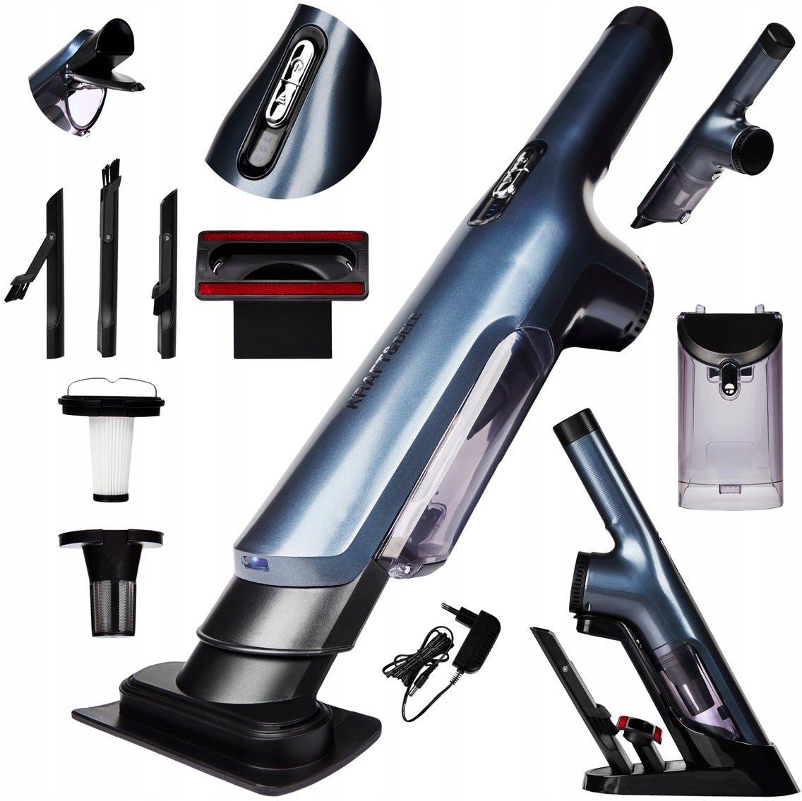 ODKURZACZ RĘCZNY 2500 mAh / 400 W KD5159 OPIS Ręczny odkurzacz bezprzewodowy marki Kraft&Dele model KD5159 przeznaczony do odkurzania wnętrza samochodu. Bezprzewodowe działanie pozwala dosięgnąć w każde miejsce pojazdu, czy zakamarek w domu, bez ograniczenia kablem. Zbiornik na kurz nie wymaga zastosowania worków, dzięki temu możesz korzystać z odkurzacza nie zawracając sobie głowy przepełnionym workiem. Zbiornik opróżnisz bezpośrednio do kosza na śmieci. Elementy zbiornika oraz filtry mogą być myte, co pozwoli utrzymać urządzenie w czystości. Urządzenie zostało wyposażone w baterie litowo-jonową 2500mAh. Czas ładowania baterii to od 3 do 4 h. Wykonane z wysokiej jakości materiału. Niewielkie wymiary i dołączone akcesoria ułatwiają sprzątanie trudno dostępnych i wysokich przestrzeni. SPECYFIKACJA: Moc: 400 W Moz zmianowa: DC25.2V Moc urządzenia: 22Kpa Czas ładowania: 3-4h Bateria: 2500mAh Rozmiar: 471 x 185 x 160 mm Waga: 1,8 kg SKŁAD ZESTAWU: Odkurzacz ręczny 400W KD5159 Dysza szczelinowa do sofy Stacja ładująca Ładowarka Uniwersalna ssawka szczelinowa Oryginalne opakowanie Faktura / paragon Gwarancja