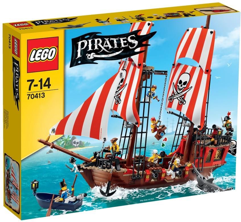 Lego Pirates Zaginiony Skarb 70413. Podnieś piracką flagę i ruszaj w morze! Banda chciwych piratów wyrusza na otwarte morze na pokładzie swojego potężnego galeonu, z ukrytą w ładowni skrzynią pełną skarbów. Jednak żołnierze w swojej łódce szybko ich dogonili i już szykują się do walki! Pomóż żołnierzom sterować łodzią i odzyskać skradziony skarb. Zaatakuj piratów od burty i dostań się na statek. Następnie dobądź broni i pokonaj swoich przeciwników. Po walce zamknij bandytów za kratkami na dobre! Zestaw zawiera: Szkielet i siedem minifigurek (kapitan piratów, pierwszy oficer piratów, pirat-majtek, kucharz piratów, admirał, sierżant i żołnierz) wraz z bronią i akcesoriami. Niesamowity statek Zaginiony skarb z serii LEGO Piraci zawiera dwa wysokie maszty z wielkimi żaglami, olinowaniem i bocianim gniazdem, piracką flagę, działający kołowrót z kotwicą, armaty, deskę dla jeńców oraz rekina piłonosa. Inne akcesoria Seria: Pirates Dla Dzieci w wieku: 7-14 Nr katalogowy: 70413 Ilość klocków w zestawie: 745