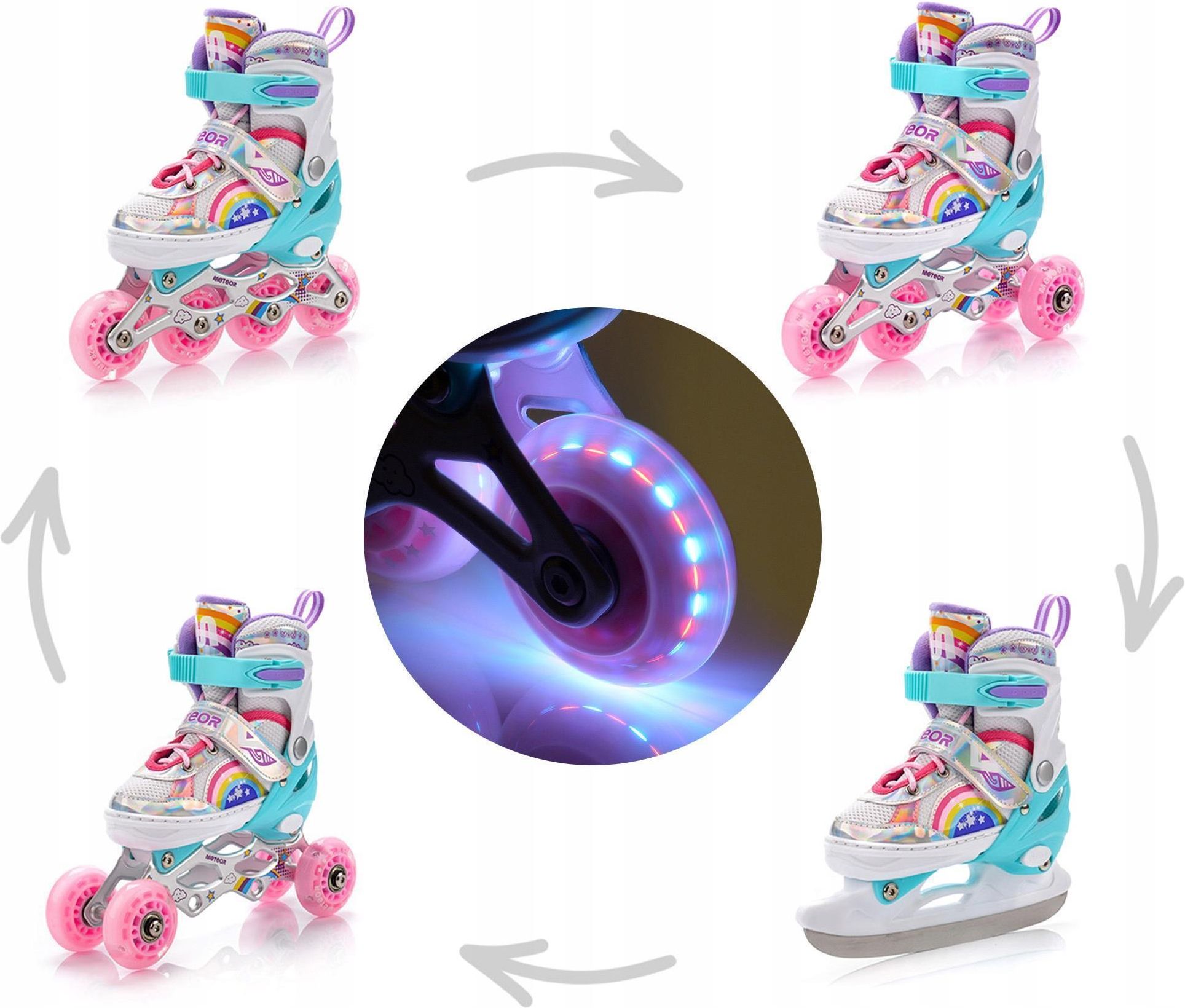 ROLKI 4w1 METEOR RAINBOW M 34-37 rolki łyżwy wrotki rolko-wrotki LED 82A Specyfikacja: Układ 4w1: łyżworolki, łyżwy, wrotki, rolko-wrotki But półmiękki, z systemem wentylacji Rozmiar: M Regulowany rozmiar: 34-37 Zakres regulacji: 21-23 cm Wzór: RAINBOW Maksymalna waga użytkownika: 60 kg Płoza: aluminium Kółka: PU Twardość kółek: 82A Łożyska: ABEC-7 Średnica kółek: 70 mm Waga: ~1.6 kg Waga z opakowaniem: ~2.65 kg. Wymiary po spakowaniu: 40 x 20 x 30 cm. Rolki przeznaczone dla wszystkich pasjonatów jazdy rekreacyjnej, którzy lubią wyróżniać się z tłumu. Produkt oferuje aż 4 możliwości konfiguracji - łyżwy, łyżworolki, wrotki oraz rolko-wrotki, dzięki temu, sprawdza się zarówno latem, jak i zimą. Specjalna budowa pozwala na łatwą regulację rozmiaru, a zatrzask zapewnia zmianę tylko wtedy, gdy tego chcesz. Konstrukcja skorupy umożliwia ruch i zmianę pozycji stopy w trakcie jazdy, nie tracąc przy tym usztywnienia. Dzięki zastosowaniu połączenia płozy z aluminium i łożysk ABEC-7 carbon, rolka jest lekka i wytrzymała, a jazda płynna i relaksująca. Poliuretanowekółka gwarantują bardzo dobre parametry jezdne. Dodatkowo wysoko zabudowana z tyłu skorupa stabilizuje kostkę i zapobiega kontuzji.