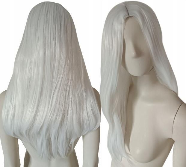 Peruka BEZ GRZYWKI biała gęsta termoodporna długa Wysokiej jakości peruka termoodporna, którą można stylizować na ciepło. Peruka ma długie, gęste, nieplączące się włosie o długości 70cm. Posiada wstawkę z imitacji skóry wzdłuż przedziałka dla naturalnego wyglądu. Peruka ma przedziałek na środku. …