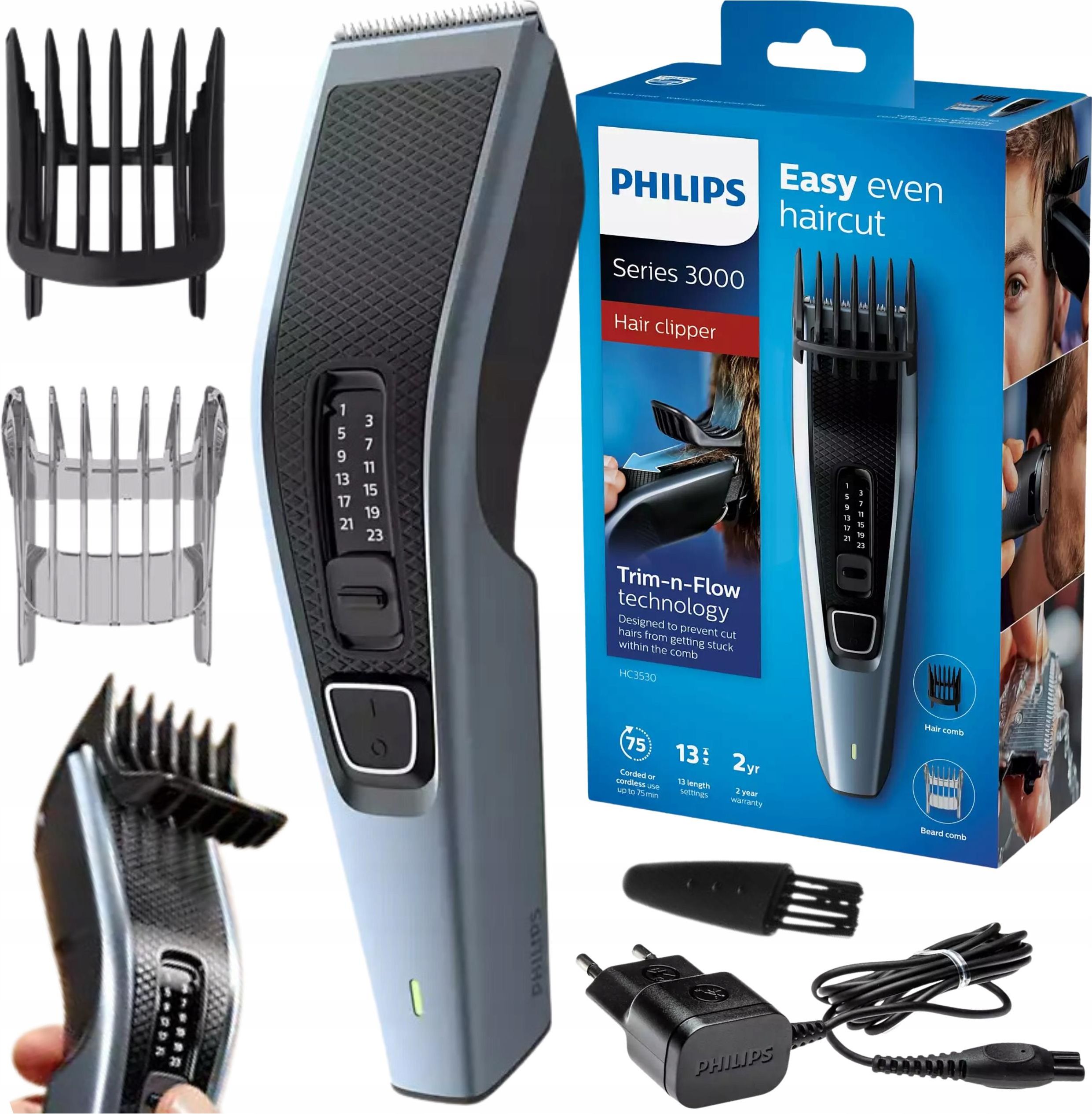 MASZYNKA GOLARKA PHILIPS STRZYŻENIA WŁOSÓW ZAROSTU BRODY CIAŁA BEZPRZEWODOW Absolutny bestseller wśród maszynek Philips do strzyżenia! NIEZAWODNA MASZYNKA PHILIPSA Dwukrotnie szybsze strzyżenie dzięki technologii DualCut. Nasadka Trim-n-Flow zapobiega zapychaniu włosami. Do 75 minut bezprzewodowego działania na jednym ładowaniu. 13 ustawień długości od 0,5 mm do 23 mm. Łatwe czyszczenie dzięki zdejmowanym, zmywalnym ostrzom. Samoostrzące się ostrza ze stali szlachetnej. Działanie sieciowe i akumulatorowe. Łatwe, szybkie i równe strzyżenie Poznaj strzyżarkę do włosów Philips Series 3000 HC3530/15, która została zaprojektowana, aby zapewnić szybkie i dokładne przycinanie włosów. Dzięki zaawansowanym technologiom DualCut i Trim-n-Flow, strzyżenie jeszcze nigdy nie było tak proste i bezproblemowe. Technologia DualCut Philips Series 3000 jest wyposażona w innowacyjną technologię DualCut, która wykorzystuje podwójne, samoostrzące się ostrza. Dzięki temu strzyżenie jest dwa razy szybsze, a precyzja cięcia utrzymuje się na najwyższym poziomie nawet po kilku latach użytkowania. Ostrza wykonane ze stali szlachetnej są wyjątkowo trwałe i nie wymagają smarowania, co ułatwia konserwację. Technologia Trim-n-Flow Specjalna nasadka grzebieniowa Trim-n-Flow została zaprojektowana tak, aby zapobiegać zapychaniu się włosami. Dzięki temu możesz przycinać włosy bez zbędnych przerw, co znacznie skraca czas stylizacji. Nasadka umożliwia płynne przesuwanie się włosów, co zapewnia wygodę i efektywność strzyżenia. 13 ustawień długości Strzyżarka oferuje aż 13 ustawień długości, które można łatwo dostosować za pomocą pokrętła. Zakres długości wynosi od 0,5 mm do 23 mm, z precyzyjnymi odstępami co 2 mm. To umożliwia idealne dopasowanie długości włosów do Twoich preferencji, zarówno przy strzyżeniu włosów, jak i brody. Działanie sieciowe i akumulatorowe Strzyżarka Philips Series 3000 HC3530/15 może działać zarówno na zasilaniu sieciowym, jak i akumulatorowym. Pełne naładowanie trwa 8 godzin i zapewnia do 75 minut bezprzewodowego działania. To idealne rozwiązanie dla osób ceniących sobie mobilność i wygodę użytkowania Ergonomiczny uchwyt Teksturowany uchwyt strzyżarki zapewnia doskonałą kontrolę i komfort podczas użytkowania. Ergonomiczna konstrukcja sprawia, że urządzenie pewnie leży w dłoni, co umożliwia precyzyjne przycinanie nawet w trudno dostępnych miejscach. Łatwość czyszczenia Strzyżarka posiada zdejmowane ostrza, które można łatwo umyć pod wodą. Wystarczy otworzyć głowicę, aby zwolnić ostrza i wyczyścić je za pomocą dołączonej szczoteczki. Dzięki temu utrzymanie urządzenia w czystości jest szybkie i proste. Zawartość zestawu Strzyżarka Philips Series 3000 Regulowana nasadka grzebieniowa Dodatkowa regulowana nasadka do brody Grzebień-nakładka Szczoteczka do czyszczenia Instrukcja obsługi Karta gwarancyjna Specyfikacja techniczna Rodzaj baterii/akumulatora: Ni-MH Czas pracy: Do 75 minut Automatyczne napięcie: 100–240 V Ładowanie: Pełne ładowanie trwa 8 godzin Szerokość nożyka: 41 mm Technologia Trim-n-Flow: Tak Element tnący: Ostrza ze stali szlachetnej Zakres ustawień długości: Od 0,5 do 23 mm Liczba ustawień długości: 13 Precyzja (wielkość odstępów): Co 2 mm Ergonomiczny uchwyt: Tak Możliwość mycia pod wodą: Tak Nie wymaga smarowania: Tak Działanie sieciowe i akumulatorowe: Tak Zgodnie z Art. 38. ustawy o prawach konsumenta - prawo odstąpienia od umowy zawartej poza lokalem przedsiębiorstwa lub na odległość nie przysługuje konsumentowi w odniesieniu do umów, w której przedmiotem świadczenia jest rzecz dostarczana w zapieczętowanym opakowaniu, której po otwarciu opakowania nie można zwrócić ze względu na ochronę zdrowia lub ze względów higienicznych, jeżeli opakowanie zostało otwarte po dostarczeniu.