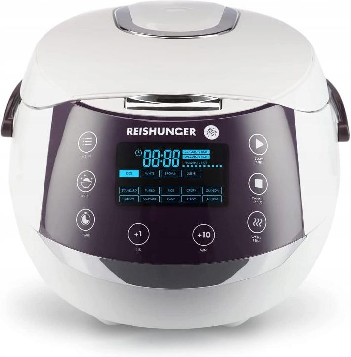 Urządzenie cyfrowe do gotowania ryżu firmy Reishunger Doskonale ugotowany ryż Dla szczególnie delikatnego przygotowania i perfekcyjnie ugotowanego ryżu, cyfrowy ryzowar firmy Reishunger posiada 7-fazową technologię gotowania opracowaną specjalnie dla ryżu. Cyfrowe urządzenie do gotowania ryżu automatycznie aktywuje po kolei odpowiednie fazy gotowania: podgrzewanie, pobór wody o średniej temperaturze, fazę podgrzewania, fazę gotowania, ochronę składników odżywczych, krótki pobór wody i wreszcie fazę utrzymywania ciepła. W ten sposób składniki odżywcze zostają zachowane, a aromat może się rozwijać w najlepszy możliwy sposób. Dzięki dołączonemu wkładowi parowemu można łatwo i delikatnie gotować warzywa, ryby i owoce morza równolegle z procesem gotowania na unoszącej się parze. Oczekiwanie jest najlepszą radością! Dzięki funkcji timera można planować z wyprzedzeniem do 24 godzin. Wystarczy ustawić timer na żądany czas, dodać ryż i wodę, a następnie nacisnąć przycisk start. Gdy tylko ziarno zostanie ugotowane, cyfrowa kuchenka do gotowania ryżu przełącza się w tryb utrzymywania ciepła - dzięki temu już nigdy nie przypalisz ryżu, gdy jesteś zajęty innymi sprawami. Cyfrowy wyświetlacz pokazuje, jak długo ryż jest ciepły. Nowoczesny wyświetlacz jest łatwy i intuicyjny w obsłudze oraz zapewnia perfekcyjnie ugotowany ryż za każdym razem - niezależnie od tego, czy jest to ryż do sushi, ryż jaśminowy czy ryż pełnoziarnisty! 12 programów do ryżu, płatków śniadaniowych i innych Zawsze doskonały ryż Ryż występuje we wszystkich kolorach, kształtach i smakach. Nasz ryzowar ma ponad dwanaście różnych funkcji, z specjalnie zaprojektowanymi programami dla każdego ryżu jak np.ryżu łuskanego, do ryżu pełnoziarnistego i ryżu do sushi. Istnieje również tryb chrupiący dla perskiego tahdig oraz tryb dla congee lub porrdige. Uniwersalny wśród urządzeń do gotowania ryżu Możesz również przygotować quinoa i ziarna, gotować zupy, gotować na parze warzywa, ryby i mięso lub upiec ciasto. Ryżowar, parowar, multicooker - prawdziwie wszechstronne urządzenie. Gotowanie i pieczenie Ryż Quinoa Zboża Zupy Warzywa Ryby Mięso Ciasto Ryż dla 1-8 osób Nasze urządzenie do gotowania ryżu ma pojemność 1,5 l i może z łatwością przygotować 8 porcji ryżu. Dzięki zaawansowanej technologii, zawsze gotuje idealnie ugotowany ryż - bez względu na to, czy chcesz przygotować tylko niewielką ilość dla siebie, czy też zaprosić rodzinę lub przyjaciół na nieco większe gotowanie. Wysokiej jakości pojemnik wewnętrzny Wysokiej jakości garnek wewnętrzny dzięki swojej konstrukcji zapewnia równomierne rozprowadzanie ciepła. Od wewnątrz do zewnątrz, wewnętrzny garnek jest skonstruowany w następujący sposób: 1. trwała podwójna nieprzywierająca powłoka ceramiczna. 2. stop aluminium o grubości 2,0 mm. 3. żaroodporne brązu powłoki zewnętrznej. Powłoki ceramiczne są bezpieczne dla zdrowia i żadne ziarenko ryżu nie przyklei się do dna z powodu powłoki. Łatwe czyszczenie Pożegnanie z wiecznym sprzątaniem. Czyszczenie naszego cyfrowego urządzenia do gotowania ryżu nie wymaga wiele czasu ani wysiłku. Wystarczy umyć wyjmowany pojemnik wewnętrzny i mały pojemnik na odpady ciepłą wodą z odrobiną płynu do mycia naczyń. Wnętrze urządzenia do gotowania ryżu można łatwo wyczyścić gąbką. Reishunger 7-Phase Cooking Technology dla doskonałego ryżu Etap wstępnego podgrzewania: Cyfrowe urządzenie do gotowania ryżu powoli i stopniowo zwiększa swoją temperaturę, aż do osiągnięcia 50°C. Etap wchłaniania wody: Gdy cyfrowe urządzenie do gotowania ryżu osiągnie temperaturę 60°C -80°C, ryż zaczyna wchłaniać wodę. Ten etap trwa do momentu, gdy temperatura osiągnie 80°C. Im wolniejszy wzrost temperatury, tym wyższa jakość gotowego ryżu. Dlatego etap ten trwa dłużej, jeśli wybierzesz jedno ze specjalnych ustawień ryżu. Etap podgrzewania: Gdy ryż wchłonie wodę, cyfrowe urządzenie do gotowania ryżu zaczyna się nagrzewać, doprowadzając wodę do wrzenia w temperaturze 85°C. Etap gotowania: Podczas etapu gotowania, cyfrowa kuchenka do ryżu gotuje ryż w maksymalnej temperaturze 100°C, aż ryż będzie gotowy. Etap wchłaniania składników odżywczych: Gdy ryż jest już w pełni ugotowany, cyfrowe urządzenie do gotowania ryżu obniża temperaturę do 90°C. Jest to idealna temperatura dla ugotowanego ryżu, aby ponownie wchłonąć cenne składniki odżywcze z wody i zamknąć te składniki w ziarnach. Faza rozluźnienia: Cyfrowe urządzenie do gotowania ryżu krótko utrzymuje temperaturę na poziomie ok. 80°C, aby nadmiar wody mógł odparować, a ryż stał się ładny i puszysty. Etap utrzymywania w cieple: Gdy cały nadmiar wody wyparuje, cyfrowe urządzenie do gotowania ryżu automatycznie przełącza się w tryb "keep warm", zapewniając temperaturę ryżu na poziomie 65°C. Informacje o tym produkcie Idealny ryż za naciśnięciem jednego przycisku: Pełny smak ryżu, idealna konsystencja i sposób przygotowania, który zachowuje składniki odżywcze, dzięki przełomowej 7-fazowej technologii gotowania. Nie tylko gotuje ryż: Dzięki 7 specjalnym trybom przygotowania ryżu, urządzenie to oferuje odpowiedni tryb dla każdego rodzaju ryżu. Łącznie 12 różnych programów: ryż, biały ryż, ryż pełnoziarnisty, ryż sushi, chrupiący, stożkowy, turbo, quinoa, kukurydza, zupa, para i funkcja pieczenia. Inteligentna i prosta obsługa: Intuicyjna obsługa dzięki menu z prostymi wyborami i dobrze oświetlonemu, nowoczesnemu wyświetlaczowi. Praktyczny timer i funkcja utrzymywania ciepła, aby uzyskać wyjątkowo smaczny ryż, kiedy tylko chcesz. Wysokiej jakości garnek wewnętrzny zapobiega przypalaniu: Wysokiej jakości wewnętrzny garnek z praktycznymi uchwytami i podwójną powłoką ceramiczną, zapobiegającą przywieraniu. Dystryb