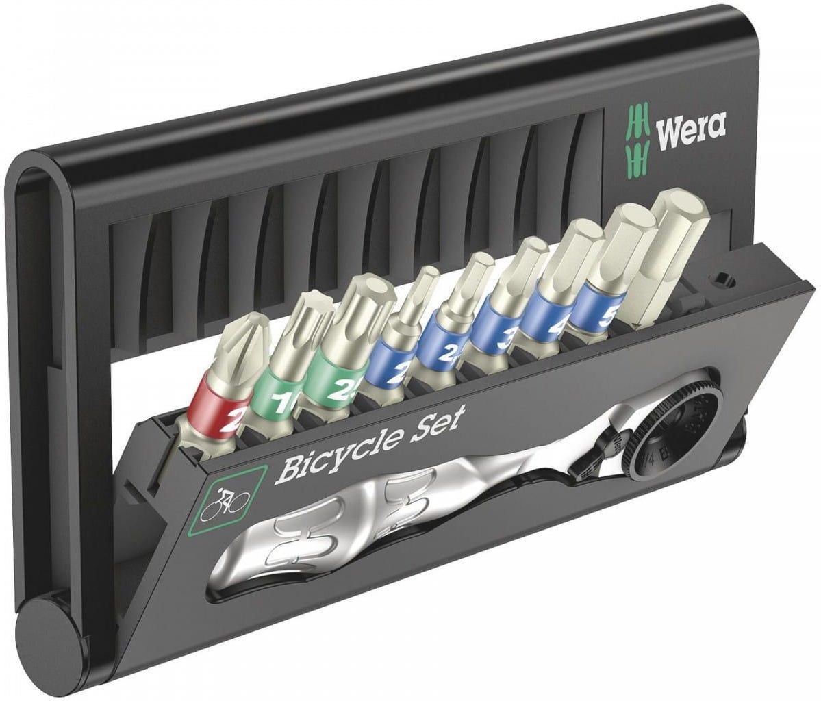 Bity Wera Wera Werk 05004177001 1 szt. krzyżakowy Phillips, TORX, wewnętrzny sześciokąt, zewnętrzny kwadrat Wiele narzędzi w małej przestrzeni. Sortowanie 9 bitów ze stali nierdzewnej według rodzaju nasadki i rozmiaru umożliwia szybki dostęp do odpowiedniego narzędzia. Z grzechotką na bity Wera Zyklop MIni 1 o konstrukcji kutej matrycowo z litej stali. Precyzyjny mechanizm zębowy z 60 zębami umożliwia mały kąt powrotu 6° dla precyzyjnej pracy. Radełkowane koło umożliwia szybkie wkręcanie w ciasnych miejscach, gdy nie ma miejsca na zapadkę. Łatwe przełączanie lewo/prawo. Ergonomiczna konstrukcja główki i przełącznika. Z systemem wyszukiwania narzędzi Take it easy z oznaczeniem kolorystycznym rozmiaru - do łatwego i szybkiego wyszukiwania niezbędnych narzędzi. Dane techniczne Końcówka (wkrętaka): 1/4" Pasuje do łba o kształcie: krzyżakowy Phillips, TORX, wewnętrzny sześciokąt, zewnętrzny kwadrat 1x 3851/1 bity TS, stal nierdzewna, PH 2 x 25 mm, 2x 3867/1 bity TS TORX, stal nierdzewna: TX 10x25, TX 25x25, 6x 3840/1 bity TS, stal nierdzewna: 2.0x25, 2.5x25, 3.0x25, 4.0x25, 5.0x25, 6.0x25, 1x zestaw Bicycle 9, 10-częściowy, 1x grzechotka do bitów 8001 1/4, 1/4 x 87 mm