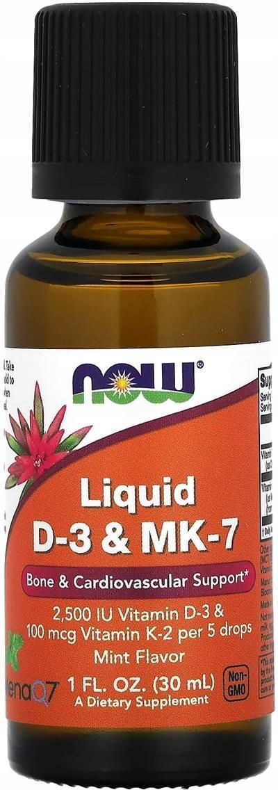 NOW FOODS Witamina D-3 / K-2 MK7 30 ml to wysoce przyswajalny i nowoczesny suplement diety, który łączy w sobie synergiczne działanie witaminy K2 i D3. Warto sięgnąć po ten preparat, zwłaszcza w chwilach przesilania wiosennego jesiennego czy okresu zimowego kiedy ekspansja na promienie słoneczne jest mała. Preparat NOW FOODS Witamina D-3 / K-2 MK7 30 ml warto stosować wraz z dietą bogatą w tłuszcze ponieważ powyższe witaminy, są rozpuszczalne w tłuszczach i ich efektywność wzrasta przy takiej diecie. Witamina K2 korzystnie wspiera krzepnięcie krwi i wspiera zdrowie kości. Dlaczego warto stosować NOW FOODS Witamina D-3 / K-2 MK7 w kroplach 30 ml? Witamina D3 jest witaminą słońca, ponieważ powstaje w skórze człowieka pod wpływem promieni UV. Jednak obecny styl życia, stosowanie wysokich filtrów w kremach przeciwsłonecznych oraz brak wystarczająco dużego wpływu słońca w miesiącach zimowych na nasz organizm prowadzi do jej niedoboru. Specjaliści mówią nawet o 90% osób w społeczeństwie z niedoborem tej cennej witaminy. Do najważniejszych właściwości witaminy D3 należy: wsparcie układu kostno-stawowego i zębów, wsparcie organizm w utrzymaniu prawidłowego poziomu wapnia we krwi oraz wzmacnia dostępność fosforu, wsparcie układu immunologicznego czy wsparcie układu nerwowego. Witamina K2 w suplemencie diety NOW FOODS Witamina D-3 / K-2 MK7 30 ml jest w formie dobrze przyswajalnej dla organizmu MK7. Witamina K2 podobnie jak witamina D3 wspiera zdrowie kości i przyczynia się do prawidłowego krzepnięcia krwi czy wspiera układ sercowo-naczyniowy. Może również wspierać organizm w leczeniu stanów zapalnych. Wartość odżywcza: Zawartość w 5 kroplach (ok.0,184ml) oraz %RWS*: Witamina K-2(jako menachinon-7)(MK-7)(MenaQ7) 100µg, RWS 83% Witamina D3 (Cholekalcyfer)(z lanoliny) 62,5µg, RWS 1250 %* *RWS-dzienne Referencyjne Wartości Spożycia witamin i składników mineralnych Składniki: Witamina K-2(jako menachinon-7)(MK-7)(MenaQ7) Witamina D3 (Cholekalcyfer)(z lanoliny) MKCT Oil (średniołańcuchowa triglicerydy)(z oleju kokosowego/oleju palmowego). NIE ZAWIERA: pszenicy, soi, mleka, jajek, ryb, skorupiaków. Sposób użycia: Dobrze wstrząsnąć 5 kropli dziennie bezpośrednio lub z ulubionym napojem. Najlepiej przyjmować z posiłkiem zawierającym tłuszcz. Ostrzeżenie: Produkt tylko dla dorosłych. Nie zalecany kobietom w ciąży, karmiących piersią. Nie przekraczać zalecanej porcji do spożycia w ciągu dnia. Produkt nie może być stosowany jako substytut zróżnicowanej diety. Zrównoważony sposób żywienia oraz zdrowy tryb życia są podstawą prawidłowego funkcjonowania organizmu. Przechowywanie: Przechowywać w temperaturze pokojowej, w sposób niedostępny dla małych dzieci. Producent: Now Foods, 395 S Glen Ellyn Road, Bloomingdale, IL 60108 USA Zawartość: 30ml Kilka słów o producencie: Firma Now Foods w prowadzonej od 1968 roku działalności każdym dniem zapracowała sobie na miano najbardziej renomowanego producenta w branży w USA. Potwierdzają to liczne tytuły i nagrody: Producent Roku 2003 w USA, Najlepsza Marka w sklepach ze zdrową żywnością w USA w 2004 roku. Now Foods mając na celu najwyższą satysfakcję swoich klientów produkuje tylko najwyższej dostępnej farmaceutycznej klasy. Dla zapewnienia bezwzględnej jakości podstawowych składników każdy z naszych dostawców jest przez nas kontrolowany w nieregularnych audytach. Now Foods robi wszystko co możliwe, aby najwyższa jakość produktów mogła być zaoferowana klientom w cenie, na którą mogą sobie pozwolić.