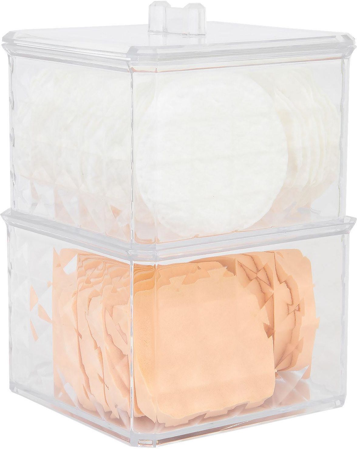Cechy produktu: elegancki design przezroczyste tworzywo 2 pojemniki nakładane na siebie z wieczkiem wymiary maksymalne: szerokość 9 x długość 9 x wysokość 13,5 cm waga: 250 g akcesoria kosmetyczne nie są częścią zestawu Praktyczny i elegancki organizer kosmetyczny do położenia na toaletce czy w szafce. Pomieści nasze płatki czy patyczki kosmetyczne i pozwoli przechowywać je w porządku. Tylko kobieta zrozumie jak ważne jest przechowywanie kosmetyków do makijażu w sposób schludny i usystematyzowany. Nic nam nie zginie, nic nam się nie zapodzieje wszystko będzie na miejscu i pod ręką, a makijaż codzienny jak i ten imprezowy zrobimy szybciej, łatwiej i przyjemniej. Ale w czym przechowywać nasze waciki czy gąbki do makijażu? W praktycznym, pomysłowym organizerze na kosmetyki! Wykonany z mocnego, przezroczystego tworzywa posiada 2 nakładane na siebie pojemniki, które pomieszczą nasze skarby. Wymiary organizera to 9 na 9 na 13,5 cm, a waga to 250 g.