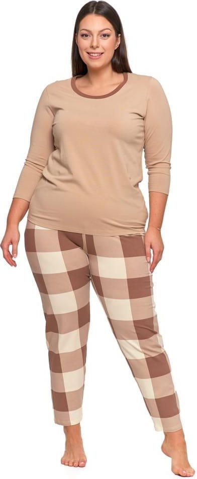 Piżama damska Moraj z rękawem o długości 3/4. Góra piżamy jednolita w kolorze beżowym, dekolt półokrągły obszyty kontrastową lamówka, rękawy proste. Spodnie długie wzorzyste w kratę, w pasie szeroka elastyczna guma, nogawki proste. Skład: 95% bawełna 5% elastan
