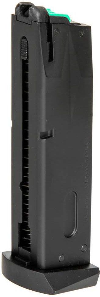 Magazynek przeznaczony do repliki GPM9 MK3 firmy G&G zasilanej Green Gazem. Dwurzędowy magazynek o pojemności 27 kulek . Korpus magazynka wykonany jest z metalu. Dane techniczne Przeznaczenie: G&G GPM9 MK3 Pojemność: 27 kulek Zasilanie: Green gaz Materiał: Metal i tworzywo sztuczne Waga: 315 g Kolor: czarny Producent: G&G Armament