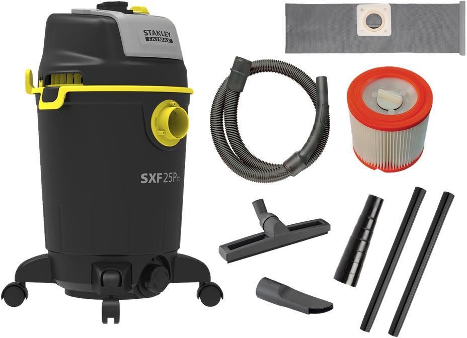 Odkurzacz przemysłowy Fatmax SXFVC25PTD-E marki Stanley! Zbiera zarówno suchy, jak i mokry brud. Z funkcją dmuchawy, filtrem do prania i akcesoriami.