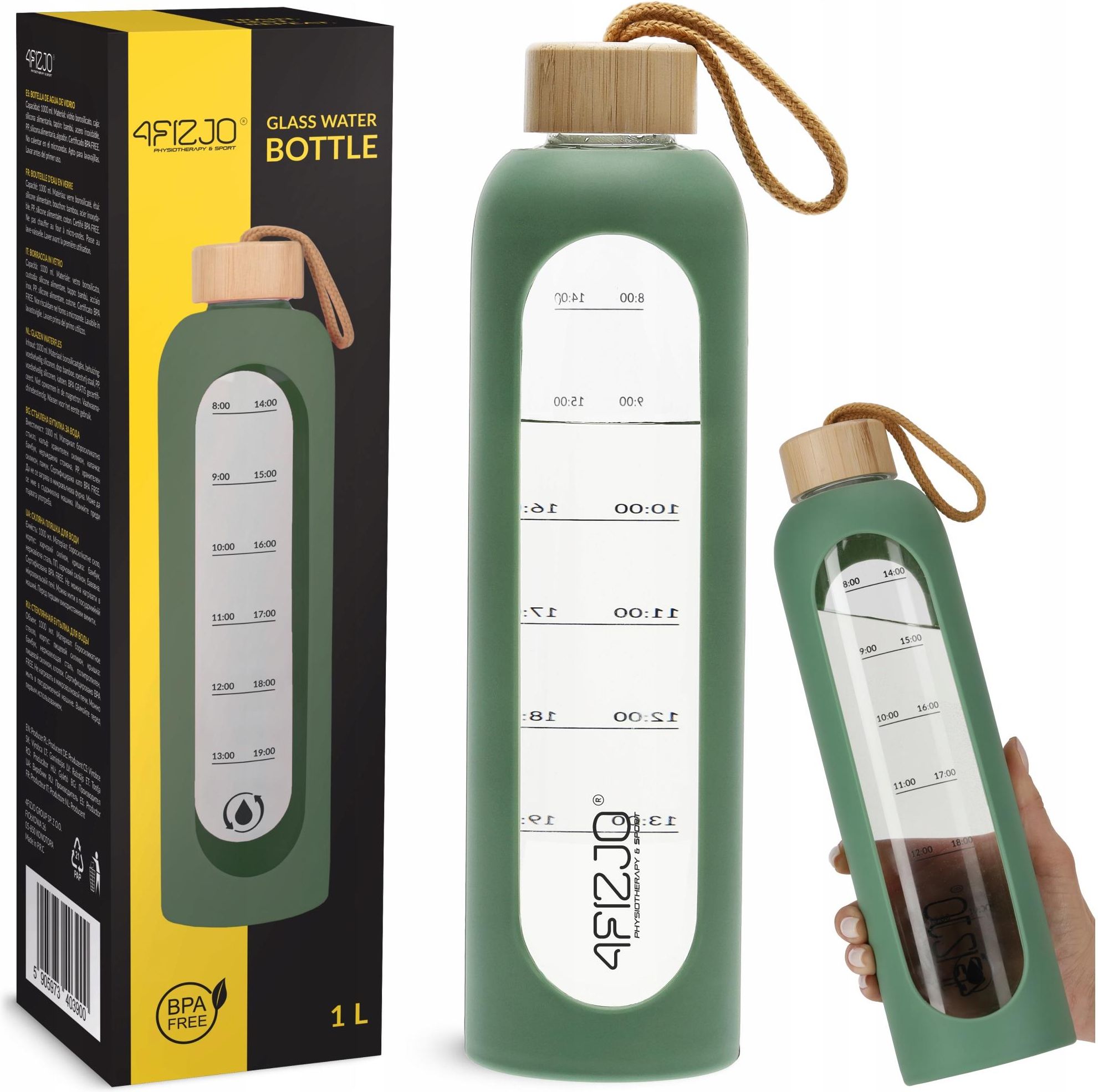 4FIZJO Butelka Szklana Na Wodę Bidon Motywacyjna Szczelna Silikonowe Etui 1L Zielony Piła