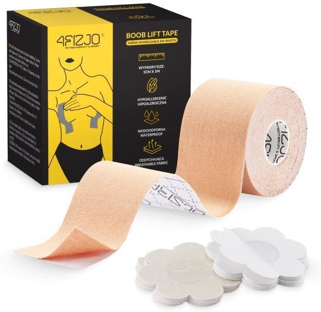 4FIZJO Taśma do biustu modelująca bezowa 5mx5cm+ 10 bawełnianych nasutników Modelująca Taśma do Biustu 5 m x 5 cm, Beżowa Marzysz o perfekcyjnie podkreślonym biuście? Szukasz szybkiego i bezpiecznego sposobu na lifting piersi bez operacji? Z naszą elastyczną taśmą do biustu 4FIZJO możesz z łatwością nosić swoje ulubione ubrania, bez konieczności zakładania biustonosza. Taśma dyskretnie unosi piersi, modelując je w idealny sposób. Jeśli cenisz wygodę, pełen komfort i swobodę ruchu, wybierz naszą praktyczną taśmę unoszącą biust 4FIZJO! Produkt ten sprawdzi się zarówno przy małym, średnim, jak i dużym biuście. Aby wybrać taśmę idealnie dopasowaną do Twoich potrzeb, zapoznaj się z poniższymi parametrami: Parametry: Kolor: Beżowy Przeznaczenie: Do biustu Rozmiar: 5 m x 5 cm Materiał: Bawełna, elastan Poziom elastyczności: 170% Zestaw zawiera: 10 bawełnianych nasutników Komfort i dyskrecja z taśmą modelującą 4FIZJO Modelująca taśma do biustu 4FIZJO to doskonałe rozwiązanie dla kobiet, które pragną poczuć się pewniej. Dyskretny zamiennik biustonosza idealnie podkreśla kształty i sprawia, że biust wydaje się bardziej jędrny. Taśma świetnie sprawdza się w każdej sytuacji – pozwoli Ci bez obaw założyć sukienkę z głębokim dekoltem, kombinezon z odkrytymi plecami lub bluzkę bez ramiączek. Cielisty, beżowy kolor pozostaje niewidoczny pod ubraniami, zapewniając pełną swobodę ruchu. Wysoka jakość i komfort użytkowania Taśma modelująca i podtrzymująca biust została wykonana z wysokiej jakości materiałów: bawełny i elastanu. Dzięki temu zapewnia maksymalny komfort, jest łatwa w aplikacji i noszeniu. Kluczowe cechy taśmy 4FIZJO to: Oddychalność – pozwala skórze oddychać Wodoodporność – nie odkleja się pod wpływem wody czy potu Wytrzymałość – utrzymuje się na skórze przez wiele godzin Elastyczność – dopasowuje się do ciała Hipoalergiczność – bezpieczna dla alergików. 2Modelująca taśma do biustu 4FIZJO (5 m x 5 cm) unosi i kształtuje piersi bez biustonosza. Wodoodporna, oddychająca, hipoalergiczna. Idealna do ubrań z odkrytymi plecami. Komfort i dyskrecja na co dzień.