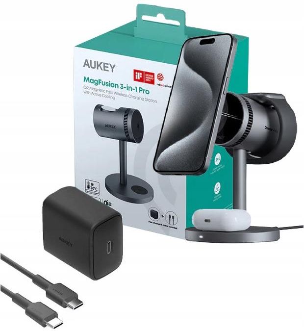 LC-MC311A 3w1 Qi2 ładowarka bezprzewodowa MagSafe 15W chłodząca + ładowarka PD 30W AUKEY LC-MC311A ŁADOWARKA BEZPRZEWODOWA 15W | 3w1 | USB-C | Qi2 (Qi 2.0) z AKTYWNYM CHŁODZENIEM AUKEY MagFusion MagSafe 3w1 LC-MC311A bezprzewodowa chłodząca stacja ładująca 3w1 do iPhone, AirPods, Apple Watch i …