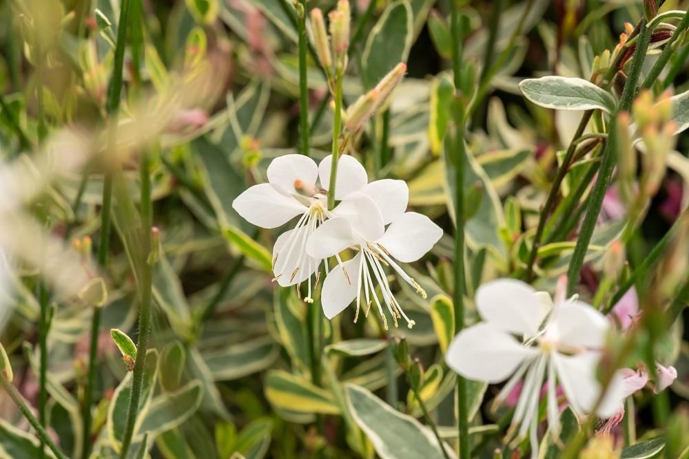 Gaura 'Corrie's Gold' to elegancka bylina o zwiewnym pokroju, która z pewnością doda uroku każdemu ogrodowi. Osiągając wysokość od 70 do 90 cm oraz szerokość 50-60 cm, tworzy efektowne kępy o delikatnym wyglądzie. Jej największym atutem są niezwykłe liście – wąskie, lancetowate, z charakterystycznym dwubarwnym ubarwieniem, gdzie ciemnozielony środek otacza szeroką biała lub kremowo-żółta obwódka. To sprawia, że roślina jest wyjątkowo dekoracyjna, nawet poza sezonem kwitnienia. Kwiaty Gaura 'Corrie's Gold' pojawiają się w obfitości od czerwca do października, przyciągając wzrok swoim czystym białym kolorem, który pięknie kontrastuje z pstrym ulistnieniem. Kwiaty przypominają małe motyle, unoszące się na cienkich, giętkich pędach, nadając ogrodowi lekkości i dynamizmu. Atrakcyjna dla pszczół i motyli, Gaura stanowi cenne źródło pożywienia w drugiej części sezonu wegetacyjnego. Jej odporność na sarny i króliki to dodatkowy atut. Gaura 'Corrie's Gold' to bylina wieloletnia, lecz jej mrozoodporność jest umiarkowana, wynosząca strefę 6, z tolerancją do -20°C. W chłodniejszych regionach zaleca się okrycie rośliny na zimę, szczególnie na stanowiskach narażonych na silne mrozy. Roślina preferuje pełne słońce, wymagając co najmniej 6 godzin bezpośredniego nasłonecznienia dziennie dla osiągnięcia zwartych kęp i obfitego kwitnienia. Gleba powinna być lekka, przepuszczalna, piaszczysta lub piaszczysto-gliniasta o odczynie lekko kwaśnym do neutralnego, z dobrym drenażem, ponieważ Gaura nie toleruje nadmiaru wody, co może prowadzić do gnicia korzeni. Umiarkowane podlewanie jest kluczowe, szczególnie w pierwszym roku po posadzeniu; roślina staje się odporna na suszę po dobrym ukorzenieniu. Regularne usuwanie przekwitłych kwiatów sprzyja długiemu kwitnieniu, a wiosenne przycinanie kępy nisko nad ziemią pobudza nowy wzrost. W regionach o surowszym klimacie warto na zimę przykryć roślinę lekkim materiałem, tak aby uniknąć gnicia. Idealna do różnych zastosowań w ogrodzie, Gaura 'Corrie's Gold' doskonale nadaje się na rabaty bylinowe jako roślina frontowa lub środkowa, harmonizuje z roślinami o bardziej zwartym pokroju, jak szałwie czy rudbekie. Jej kompaktowy wzrost sprawia, że świetnie prezentuje się w na tarasach, balkonach czy patio. W ogrodach naturalistycznych i preriowych, jej eteryczny wygląd znakomicie współgra z trawami ozdobnymi i kamieniami. Gaura 'Corrie's Gold' to niezawodna propozycja, która wprowadzi do Twojego ogrodu subtelne piękno, ciesząc oczy liśćmi i delikatnymi kwiatami przez całe lato i jesień.