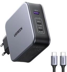Ładowarka sieciowa Ugreen Nexode 140W C289, GaN, 2x USB-C, USB (czarna) + kabel USB-C 2m Specyfikacja Producent: UGREEN Model: CD289 Ilość portów USB-C: 2 Ilość portów USB-A: 1 Wejście: 100-240 V, 50/60 Hz, 2A Max Wyjście: USB-C1: 5V / 3A, 9V / 3A, 12V / 3A, 15V / 3A, 20V / 5A, 28V / 5A, 140W Max PPS: 2.2-21V / 5A; USB-C2: 5V / 3A, 9V / 3A, 12V / 3A, 15V / 3A, 20V / 5A, 10W Max PPS: 3.3-21 V / 5A; USB-A: 4.5V / 5A, 5V / 4.5A, 5V / 3A, 9V / 2A, 12V / 1.5A, 22.5W Max Maksymalna moc ładowania: 140 W W zestawie Ładowarka Kabel USB-C do USB-C o długości 2 m Ładuj szybko i bezpieczne wiele urządzeń w tym samym czasie! Ładowarka sieciowa UGREEN posiada 3 wbudowane porty USB (2x USB-C, USB), dzięki czemu zasilisz energią kilka sprzętów jednocześnie. Wspiera wiele protokołów szybkiego ładowania, a jej maksymalna moc wynosi aż 140 W. Produkt współpracuje m.in. z telefonami, tabletami, słuchawkami TWS oraz laptopami, oraz wykorzystuje technologię GaN II. Do zestawu dołączono również kabel USB-C/USB-C. Błyskawiczne ładowanie urządzeń Ładowarka wyposażona została w 3 porty USB – 2x USB-C i USB-A, które umożliwiają ładowanie z mocą nawet 140W! Ponadto ładowarka wspiera standardy szybkiego ładowania PD 3.1 / 3.0, QC 4.0, PPS, SCP i AFC. Wystarczy 30 minut, aby naładować iPhone’a 13 do 60%, Huawei P50 do 50% czy Macbooka 16 do 56%. Ładuj, jak chcesz Ładuj bez przeszkód nawet 3 urządzenia w tym jednocześnie. W zależności od ilości podłączonych urządzeń produkt inteligentnie rozdziela moc ładowania między nimi. Ładowarka jest kompatybilna z większością popularnych na rynku sprzętów. Za jej pomocą naładujesz między innymi smartfona Apple i Samsung, bezprzewodowe słuchawki, iPada czy nawet laptopa (port USB-C). Innowacyjne rozwiązanie Urządzenie zostało stworzone w oparciu o zaawansowaną technologię GaN II. Zapewnia ona maksymalną wydajność przesyłania energii, a także odpowiada optymalne rozprowadzanie ciepła. Co więcej, rozmiar ładowarki został zmniejszony aż o 21.9% w porównaniu ze standardową ładowarką 140W.