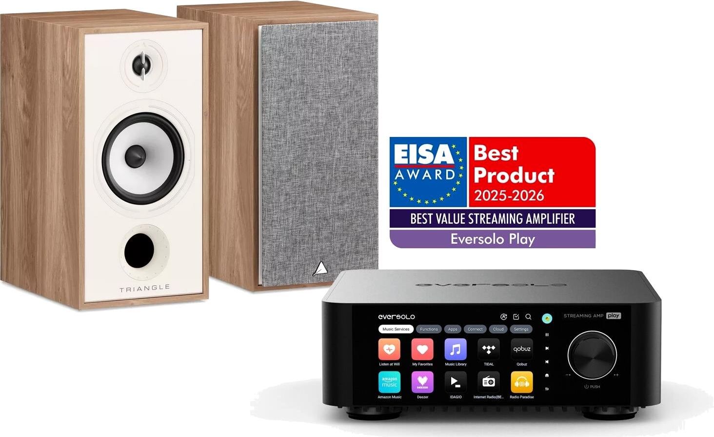EverSolo PLAY został uhonorowany prestiżową nagrodą EISA 2025-2026 w kategorii Hi-Fi jako najlepszy wzmacniacz All-in-One w segmencie budżetowym na rynku: "Niedrogi wzmacniacz zintegrowany Eversolo Play łączy w kompaktowej obudowie zaawansowaną technikę i bogactwo funkcji. Sterowany za pomocą dużego, konfigurowalnego ekranu dotykowego lub inteligentnej aplikacji, oparty na platformie Android, obsługuje serwisy muzyczne, aplikacje innych producentów oraz lokalne źródła muzyki. Korektor charakterystyki wraz z kalibracją akustyki pozwalają na optymalizację dźwięku dostosowaną do pomieszczenia, głośników i upodobań użytkownika. Sekcja połączeń obejmuje HDMI eARC, wejście gramofonowe MM/MC oraz wyjście USB do zewnętrznego przetwornikiem cyfrowo-analogowego. Eversolo Play to rozwiązanie typu ”wystarczy podłączyć głośniki”, i to bez nadwyrężania portfela. Triangle Model BR04 powstał z myślą o podniesieniu poprzeczki wyznaczonej przez popularne BR03. To kompaktowe kolumny podstawkowe, które oferują jeszcze lepsze brzmienie, nie rezygnując przy tym z przystępnej ceny. Inżynierowie Triangle skupili się na poprawie basu i przejrzystości dźwięku, jednocześnie zachowując wszystkie cechy, które uczyniły serię Borea tak cenioną.
