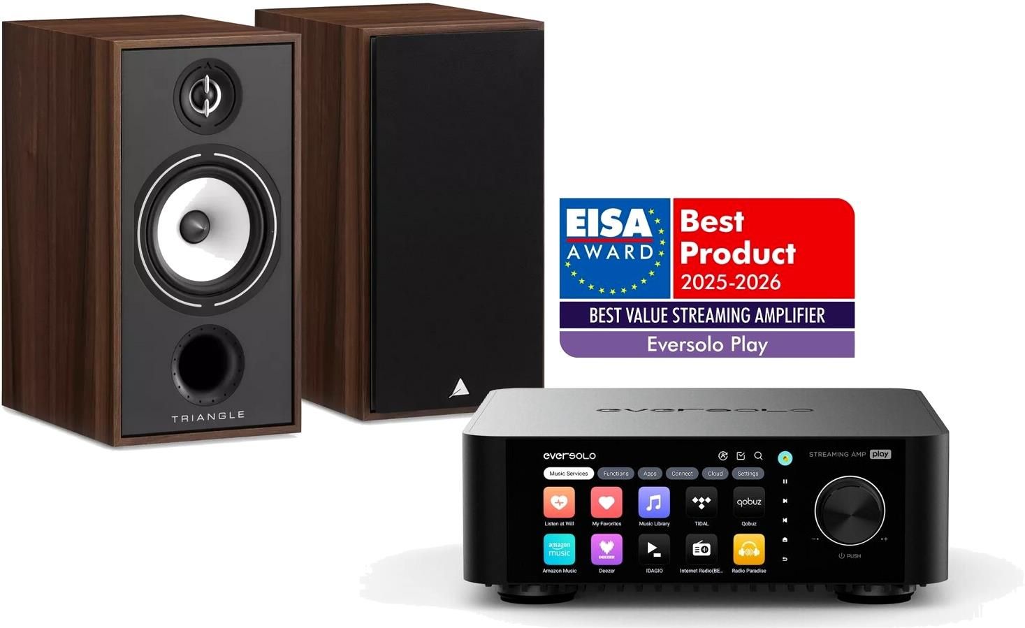 EverSolo PLAY został uhonorowany prestiżową nagrodą EISA 2025-2026 w kategorii Hi-Fi jako najlepszy wzmacniacz All-in-One w segmencie budżetowym na rynku: "Niedrogi wzmacniacz zintegrowany Eversolo Play łączy w kompaktowej obudowie zaawansowaną technikę i bogactwo funkcji. Sterowany za pomocą dużego, konfigurowalnego ekranu dotykowego lub inteligentnej aplikacji, oparty na platformie Android, obsługuje serwisy muzyczne, aplikacje innych producentów oraz lokalne źródła muzyki. Korektor charakterystyki wraz z kalibracją akustyki pozwalają na optymalizację dźwięku dostosowaną do pomieszczenia, głośników i upodobań użytkownika. Sekcja połączeń obejmuje HDMI eARC, wejście gramofonowe MM/MC oraz wyjście USB do zewnętrznego przetwornikiem cyfrowo-analogowego. Eversolo Play to rozwiązanie typu ”wystarczy podłączyć głośniki”, i to bez nadwyrężania portfela. Triangle Model BR04 powstał z myślą o podniesieniu poprzeczki wyznaczonej przez popularne BR03. To kompaktowe kolumny podstawkowe, które oferują jeszcze lepsze brzmienie, nie rezygnując przy tym z przystępnej ceny. Inżynierowie Triangle skupili się na poprawie basu i przejrzystości dźwięku, jednocześnie zachowując wszystkie cechy, które uczyniły serię Borea tak cenioną.