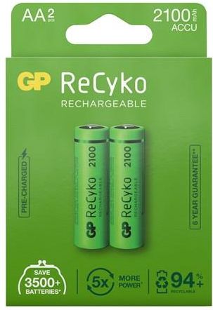 Akumulatory AA niklowo-metalowo-wodorkowe pochodzą z linii ReCyko firmy GP. Baterie mają napięcie 1,2 V i pojemność 2100 mAh. Mogą być ładowane do 500 razy, a ze względu na niski poziom samorozładowania nadal są w stanie wykorzystać 80% swojej energii nawet po 1 roku bezczynności.W ramach linii ReCyko baterie te są o wiele bardziej przyjazne dla środowiska niż podobne baterie AA. Są wytwarzane w procesie produkcyjnym, który w dużej mierze wykorzystuje materiały i surowce pochodzące z recyklingu.W opakowaniu znajdują się 2 sztuki.