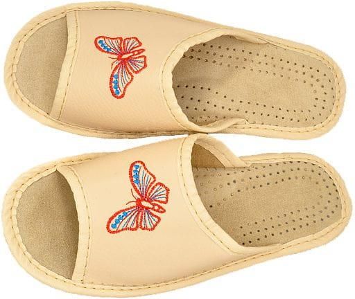 Kapcie skórzane dla dzieci z odkrytymi palcami na letni czas. Haftowany czerwony motylek na jasnobeżowym tle, skromne lecz piękne kapcie dla naszych milusińskich. Perfekcyjna sprawdzona jakość wykonania, doskonale trzymają się stopy. Wyłożone wyściółką z naturalnej skóry bydlęcej oraz wkładką z wyprofilowaniem pod śródstopie, na elastycznym gumowym spodzie. Tęgość standardowa "G" dla stóp o każdej przeciętnej szerokości oraz wysokości podbicia. Dostępne rozmiary od 27 do 34, prosimy zwrócić uwagę na długość wkładki wewnętrznej i dokładnie wymierzyć przed zakupem.