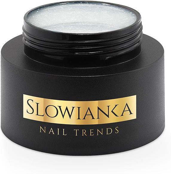 Slowianka - Żel Konstrukcyjny Ideal Tixotropic Milky Holo Cover 15g Żel Milky Holo to produkt o białym, mlecznym kolorze z holograficznymi, wielobarwnymi drobinkami. Kolory drobinek są delikatne, ale jednocześnie wyraziste. Mają formę bardzo cienkich i precyzyjnych folii o różnej wielkości. Nasycenie drobinek jest dość intensywne i dobrze widoczne, ale nie wygląda kiczowato. Milky Holo świetnie sprawdzi się u klientek, które lubią klasyczną biel z lekkim, eleganckim połyskiem. Żel Milky Holo to wyjątkowy produkt, który łączy subtelność klasycznej bieli z olśniewającym, wielowymiarowym blaskiem. Jego bazą jest mleczny, półtransparentny żel w odcieniu bieli, który pięknie stapia się z naturalną płytką paznokcia, dając efekt miękkiego rozświetlenia. Całość urozmaicona jest holograficznymi drobinkami – niezwykle cienkimi, precyzyjnymi foliami o różnej wielkości, które mienią się całą paletą barw. Ich kolory są delikatne, ale zarazem przyciągające wzrok, razem tworzą elegancki, nieprzesadzony efekt. Nasycenie drobinek jest dobrze wyważone – intensywne i wyraźne, a jednocześnie estetyczne i gustowne, bez kiczowatego efektu. Żel Milky Holo to doskonały wybór dla miłośniczek stonowanej stylizacji z nutą oryginalności. Idealnie sprawdzi się jako subtelny akcent w ślubnych stylizacjach, delikatny błysk w manicure codziennym, a także jako baza pod zdobienia. To żel, który łączy elegancję z modnym wykończeniem i pozwala tworzyć stylizacje o niebanalnym charakterze. Właściwości Kremowa konsystencja produktu jest wyjątkowo przyjemna w pracy. Dzięki niskiej lepkości aplikacja pędzelkiem przebiega bezproblemowo – włosie nie rozchodzi się, co zapobiega zapowietrzaniu żelu. Produkt charakteryzuje się idealną tiksotropią – ma wysokie napięcie powierzchniowe, samopoziomuje się, ale nie spływa na skórki, co daje styliście czas na precyzyjne modelowanie. Świetnie wygładza powierzchnię, dzięki czemu sprawdza się doskonale w technice bez piłowania. Warstwę dyspersyjną powstałą po utwardzeniu należy usunąć za pomocą cleanera. Dzięki zminimalizowanemu efektowi pieczenia podczas utwardzania, zapewnia wysoki komfort klientowi – jednak przy delikatnym łożysku warto zmniejszyć moc lampy. Twardość produktu pozwala na utrzymanie tunelu nawet przy bardzo cienkiej warstwie. Polimer krystalizuje się w głębszych warstwach niż w przypadku tradycyjnych żeli, co sprawia, że idealnie nadaje się do wzmacniania naturalnej płytki. Bardzo dobrze przylega do naturalnej płytki, szczególnie w połączeniu z odpowiednią bazą. Minimalna grubość warstwy do pełnego utwardzenia to 0,5 mm, maksymalna – 1,5 mm. Czas do wykonania zacisku wynosi od 20 do 40 sekund, w zależności od grubości aplikowanej warstwy. Czas utwardzania: 3 minuty w lampie LED, 4 minuty w lampie UV. Sposób użycia: Rozpoczynamy od wykonania manicure i zmatowienia naturalnej płytki paznokcia. Następnie przecieramy paznokcie wacikiem nasączonym cleanerem i wcieramy preparat adhezyjny Ultra Bond marki Slowianka Nail Trends. Aplikujemy cienką warstwę bazy Base Gel od Slowianka Nail Trends. Zakładamy klasyczny szablon i nakładamy cienką warstwę żelu, tworząc szkielet paznokcia, po czym utwardzamy. Po usunięciu formy nanosimy cienką warstwę poślizgową żelu, a na mokry produkt aplikujemy większą ilość, budując właściwy kształt i strukturę paznokcia. Jeśli planujemy zaciskanie tunelu, czas wstępnego utwardzania wynosi od 20 do 40 sekund – zależnie od grubości warstwy. Dla pełnego utwardzenia żelu stosujemy 3 minuty w lampie LED lub 4 minuty w lampie UV. Na koniec przecieramy warstwę dyspersyjną powstałą w trakcie polimeryzacji za pomocą cleanera.