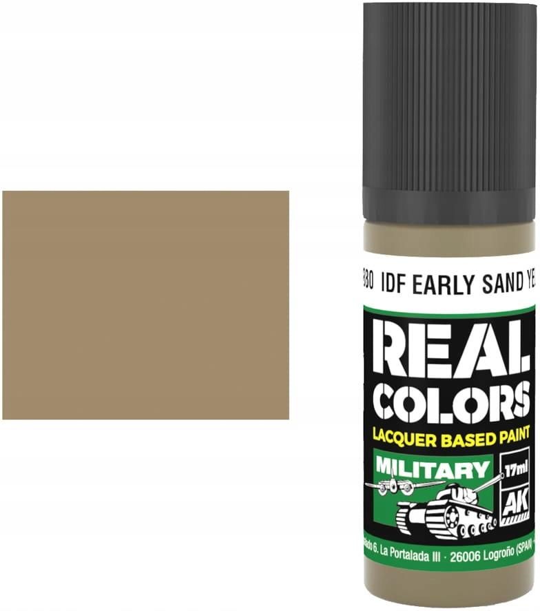 AK Interactive RC880 - Farba IDF Early Sand Yellow 17 ml Modelarska farba akrylowa na bazie rozcieńczalników organicznych z serii Real Colors producent: AK Interactive pojemność 17 ml opakowanie - plastikowa buteleczka z zakraplaczem świetnie dobrane realistyczne kolory uwzględniające efekt skali …