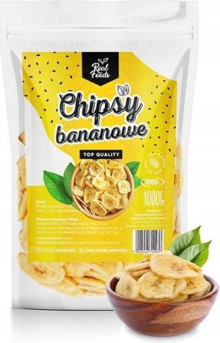 REAL FOODS CHIPSY BANANOWE 1 KG Chipsy bananowe to znakomita przekąska zrobiona z bananów kandyzowanych w roztworze miodu, cukru i oleju kokosowego. Wysokokaloryczna, pożywna, mocno energetyczna, znakomita po wysiłku. Suszone owoce bananów są łatwo przyswajalne przez organizm, zawierają mnóstwo …