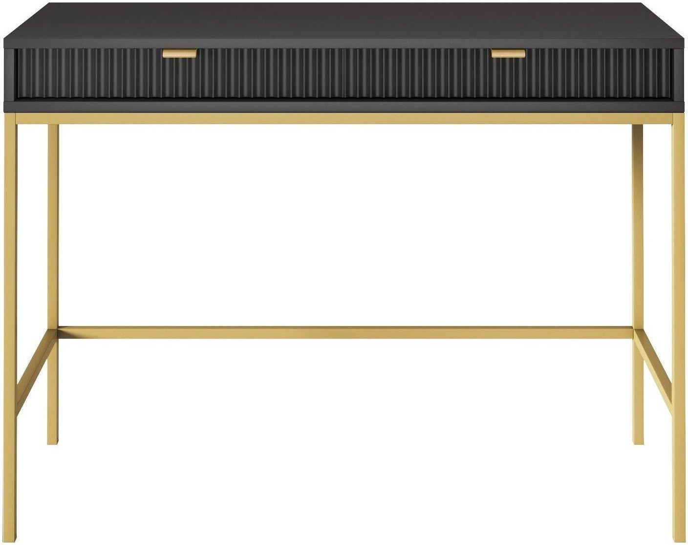 Toaletka Almagro ryflowana czarna złote nogi Toaletka Almagro czarna - Intesi Zorganizuj się w dobrym stylu. Zachwycająca toaletka zapewni nie tylko ponadczasową estetykę, ale także mnóstwo możliwości przechowywania. Wykonana z ryflowanymi frontami szuflad, które są pięknie podkreślone aluminiowym uchwytem w kolorze złotym ✅ Nowoczesny design ✅ Ryflowane fronty szuflad ✅ Aluminiowe uchwyty w kolorze złotym ✅ Mnóstwo możliwości przechowywania ✅ Wygodne odkurzanie i wycieranie pod toaletką Zamów już dziś! Wysokość (cm): 77 Szerokość (cm): 104 Głębokość (cm): 50 Kolor: złoty, czarny Kolor:: czarny Kolor blatu: czarny Kolor podstawy: złoty Materiał: płyta meblowa, metal Materiał podstawy: metal Materiał blatu: płyta meblowa Wykończenie: półmat Ilość szuflad: 2 Kształt blatu : prostokątny Wymaga montażu: tak Styl: nowoczesny, industrialny Front: frezowany pionowo Funkcje/cechy: z szufladami Rodzaj podstawy: 4 nogi Typ mebla: Meble nowoczesne, Meble industrialne, Meble czarne Pomieszczenie: pokój dziecięcy, sypialnia, salon, biuro
