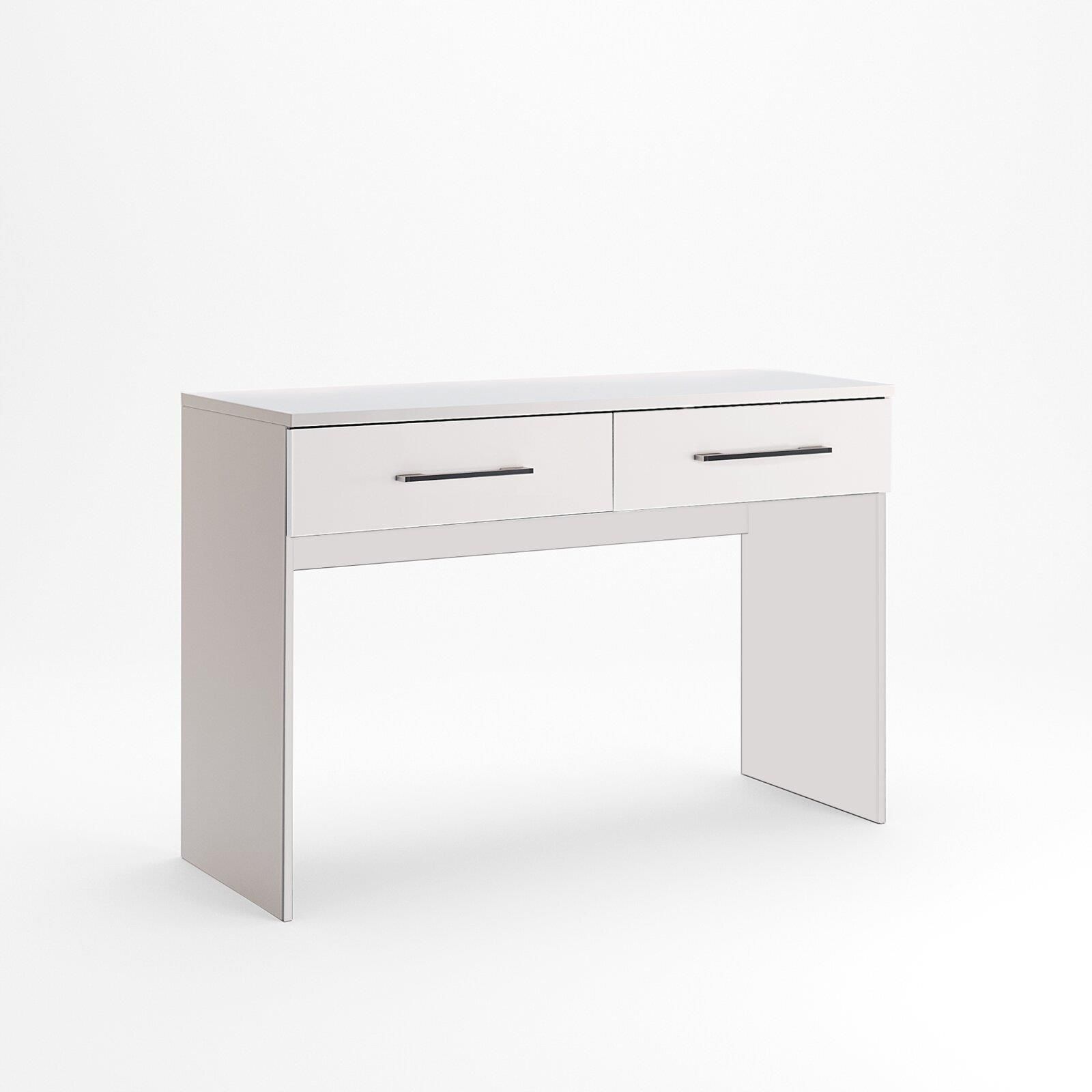 Toaletka Flory marki Intesi to nowoczesna toaletka kosmetyczna o szerokości 120 cm, wykonana z białej płyty laminowanej na wysoki połysk. Wyposażona w dwie pojemne szuflady oraz prostokątny blat, stanowi stylowe i praktyczne rozwiązanie do sypialni lub pokoju młodzieżowego. Klasyczna, …