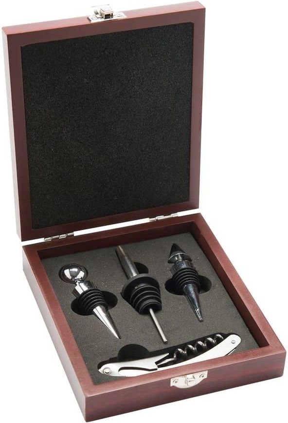 Elegancki 5 elementowy komplet akcesoriów do wina KonigHOFFER, który może być bardzo dobrym pomysłem na podarunek dla każdego entuzjasty tego rodzaju trunków. Zastosowana stal nierdzewna pozwoli ci na utrzymanie każdego z elementów w czystości oraz sprawi, że regularne użytkowanie zestawu będzie higieniczne. Akcesoria te nie wpłyną również w żaden sposób na smak podanego wina. Przyjemność płynąca z możliwości zasmakowania najbardziej wyrafinowanych gatunków win powinna otrzymać odpowiednią i gustowną oprawę. Niezbędny będzie tu więc funkcjonalny korkociąg (w tym przypadku z wbudowanym nożykiem do obcinania foli zabezpieczającej szyjkę oraz korek). Innymi akcesoriami dołączonymi do tego kompletu przez producenta są nalewak oraz dwie zatyczki (wszystko wyposażono w gumową uszczelkę podnoszącą wygodę użytkowania). Zestaw do wina Pinot został zamknięty w drewnianym pudełku z miękką wytłoczką na wszystkie wymienione elementy. Liczba elementów 5 Elementy zestawu: Korkociąg 2 zatyczki nalewak drewniane pudełko Wysokość (cm) 4.5 Długość (cm) 16,9 Szerokość (cm) 14,5 Materiał: stal nierdzewna Kolor brązowy Waga netto (g) 449 Wymiary opakowania: 18,3 x 15,5 x 5,5