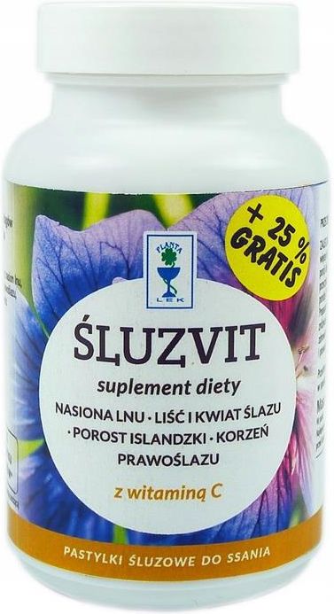 Bez cukru. Zawiera starannie dobrane wyciągi ziołowe. Wspiera regeneracje błon śluzowych, chronią gardło przed wysuszeniem i wykazują właściwości odkrztuszające.. Śluzvit Planta-Lek 80g Karmelki Śluzvit Planta-Lek - bez cukru do ssania z nasionami lnu, porostem islandzkim, ślazem, prawoślazem i witaminą C. Suplement diety Śluzvit w postaci bezcukrowych pastylek do ssania zawiera starannie dobrane wyciągi ziołowe wspierające regeneracje błon śluzowych, chronią gardło przed wysuszeniem i wykazują właściwości odkrztuszające. Dawkowanie Ssać co 2 godziny 1 pastylkę, nie więcej niż 5 pastylek dziennie. Nie należy przekraczać zalecanej porcji do spożycia w ciągu dnia. Nie zaleca się stosowania produktu u kobiet w okresie ciąży i dzieci poniżej 12.roku życia. Suplement diety nie może być stosowany jako substytut (zamiennik) zróżnicowanej diety ani aktywnego trybu życia. Utrzymanie prawidłowego stanu zdrowia wymaga zrównoważonego i zróżnicowanego odżywiania i prowadzenia zdrowego trybu życia. Istnieje wiele czynników ryzyka choroby. Zmiana jednego z tych czynników ryzyka może wywierać korzystny wpływ lub nie wywierać go. Warunki przechowywania Produkt powinien być przechowywany w temperaturze pokojowej, w sposób niedostępny dla małych dzieci. Skład Substancja słodząca - izomalt, wyciąg wodny z nasion lnu, kwiatów i liści ślazu, porostu islandzkiego, korzenia prawoślazu, witamina C (kwas L-askorbinowy), regulator kwasowości - kwas cytrynowy z nasion lnu i witamina C. Właściwości Wyciąg wodny z korzenia prawoślazu chroni błonę śluzową gardła podczas kaszlu przed wysuszeniem, ułatwia odkrztuszanie wydzieliny i sprzyja łagodzeniu dolegliwości bólowych. Wykazuje właściwości odkrztuszające oraz wspomaga w eliminowaniu chrypki. Wyciąg wodny z porostu islandzkiego wykazuje właściwości przeciwzapalne i antyoksydacyjne. Przechowywanie i dodatkowe informacje Przechowywać w temperaturze pokojowej. Chronić przed wilgocią. Przechowywać w sposób niedostępny dla małych dzieci. Nie należy przekraczać zalecanej porcji do spożycia w ciągu dnia. Produkt nie może być stosowany jako substytut zróżnicowanej diety. Zaleca się stosowanie zróżnicowanej i zrównoważonej diety i zdrowego trybu życia.