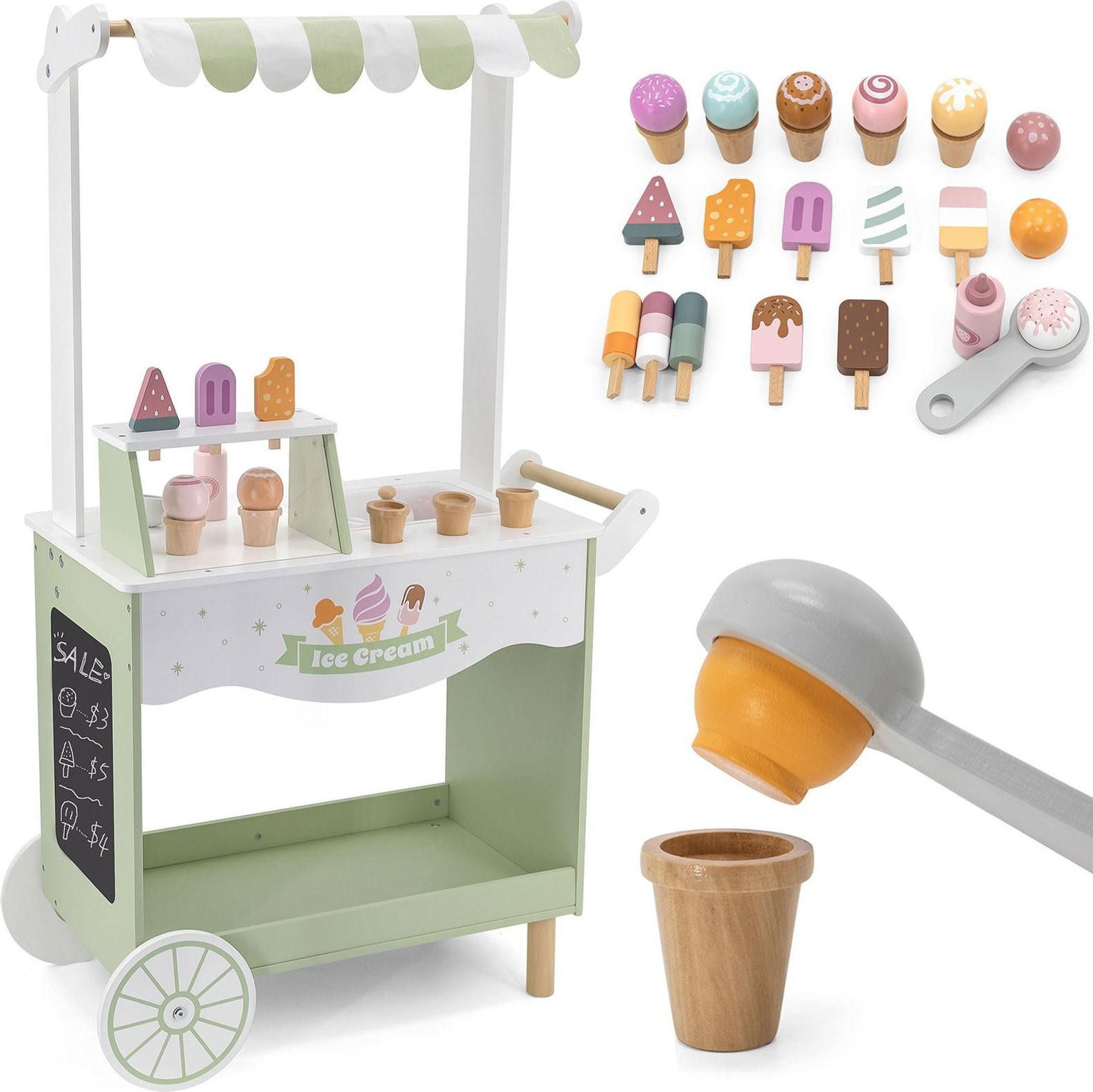 Drewniane stoisko lodowe CO WYRÓŻNIA NASZ PRODUKT **Kompletny zestaw**: Zawiera wszystkie niezbędne akcesoria - drewniane lody, rożki, szczypce, butelkę z toppingiem i tablicę do rysowania dla pełnej realizacji zabawy w sklep. **Wysokiej jakości materiał**: Wykonany w 100% z naturalnego drewna, …