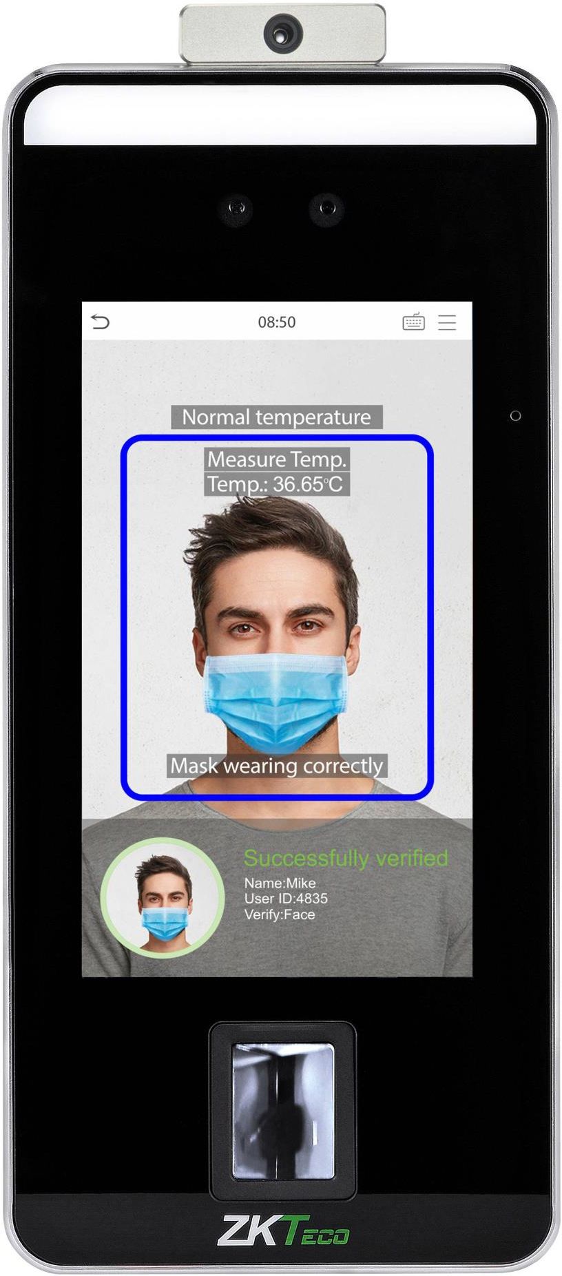SpeedFace-V5L[TD] Terminal wykrywania temperatury ciała Cechy szczególne Wykrywanie twarzy za pomocą światła widzialnego Rozpoznawanie maski Wykrywanie temperatury ciała Wiele metod weryfikacji: twarz / dłoń / odcisk palca / karta / hasło Uwierzytelnianie, wykrywanie temperatury i maskowana indywidualna identyfikacja SpeedFace-V5L [TD] to w pełni zmodernizowana wersja terminala rozpoznawania twarzy w świetle widzialnym SpeedFace-V5L, wykorzystujący inteligentne inżynieryjne algorytmy rozpoznawania twarzy i najnowszą technologię wizji komputerowej. Obsługuje on zarówno weryfikację twarzy, jak i dłoni z dużą pojemnością i szybkością rozpoznawania, a także zwiększa bezpieczeństwo we wszystkich aspektach. bezpieczeństwa we wszystkich aspektach. SpeedFace-V5L [TD] wykorzystuje technologię bezdotykowego rozpoznawania oraz nowe funkcje, takie jak wykrywanie temperatury i maskowane rozpoznawanie osób, co skutecznie eliminuje problemy związane z higieną. Jest również wyposażony w najnowszy algorytm algorytm antyspoofingowy do rozpoznawania twarzy przed niemal wszystkimi rodzajami ataków na fałszywe zdjęcia i filmy. Co ważne, rozpoznawanie dłoni 3 w 1 (Palm Shape, Palm Print i Palm Vein) odbywa się w czasie 0,35 sekundy na jedną dłoń; dane z dłoni pozyskane zostaną porównane z maksymalnie 3 tys. szablonów dłoni. Terminal z detekcją temperatury i maski będzie doskonałym wyborem, który pomoże ograniczyć rozprzestrzenianie się zarazków i pomóc zapobiegać infekcjom prosto w każdym punkcie dostępu do wszelkich pomieszczeń i miejsc publicznych, takich jak szpitale, fabryki, szkoły, budynki handlowe, dworce podczas ostatnich globalnych problemów zdrowotnych dzięki szybkiemu i dokładnemu pomiarowi temperatury ciała oraz identyfikacji osób w maskach. Dzięki szybkiemu i dokładnemu pomiarowi temperatury ciała oraz maskowanej funkcji indywidualnej identyfikacji podczas weryfikacji twarzy i dłoni.