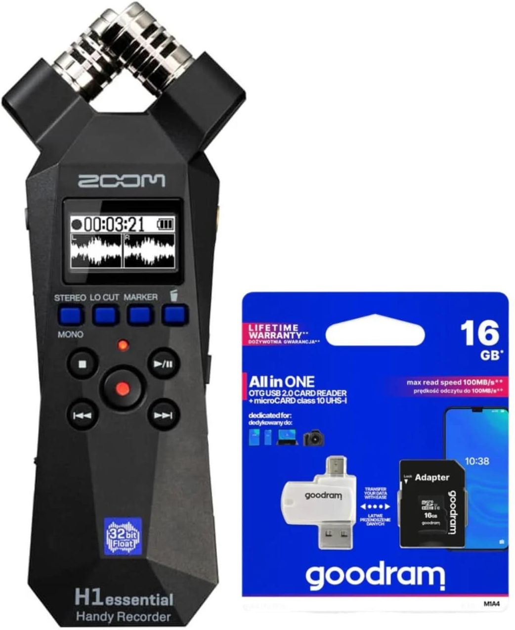 ZOOM H1Essential with GOODRAM microSDHC 16GB Memory Card ZOOM H1Essential is a compact, multifunctional audio recorder, ideal for musicians, podcasters, filmmakers, and content creators. Equipped with X/Y microphones, it captures high-quality audio, ensuring natural sound and a wide dynamic range. …