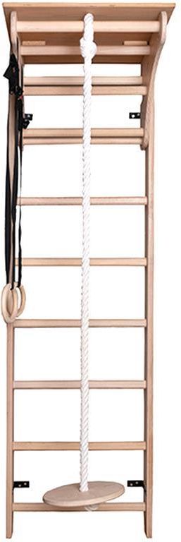 Drabinka gimnastyczna BenchK sportowa do ćwiczenia w domu Drabinka gimnatyczna frimy BenchK została wykonana z najwyższej jakości materiałów. Model może łatwo przekształcić się z urządzenia do treningu i zabawy w miejsce do pracy, dzięki biurko-nakładce. Wyposażony został w regulowany drewniany drążek do podciągania, blat biurka, kółka gimnastyczne i bawełniana lina z huśtawką. Dzięki swojej zdejmowanej konstrukcji drążek można umieścić na różnych szczeblach i dostosować do wzrostu użytkownika. Za pomocą drążka można wykonywać szeroki zakres ćwiczeń na mięśnie pleców, brzucha i ramion. Pozwala również na wykonywanie rozciągania kręgosłupa, ćwiczeń na ruchomości i treningu oporu, gdy są do niego przymocowane gumy oporowe. Wykonany ze sklejki bukowej blat biurka jest umieszczany na drewnianym drążku do podciągania. Razem tworzą stylowe i funkcjonalne biurko dla dziecka lub dorosłego. Biurko jest idealne dla miłośników minimalizmu, ponieważ pozwala zaoszczędzić wiele miejsca, łącząc strefę treningową i pracującą. Wysokość biurka można regulować do wzrostu użytkownika. Kółka są wykonane ze sklejki bukowej i zawieszone na czarnych paskach. Polerowane do perfekcji, kółka są gładkie i bezpieczne dla rąk. Paski są wyposażone w klamry, które umożliwiają szybkie dostosowanie długości oraz łatwe ich zdjęcie. W miarę jak dziecko rośnie, kółka mogą być używane jako taśma TRX. Lina jest ręcznie spleciona w górnej części w formie pętli i zabezpieczona na samej dole, eliminując konieczność użycia metalowych lub plastikowych elementów. Może być używana do wspinaczki lub po dołączeniu drewnianego talerza zawartego w zestawie jako huśtawka. Pakiet zawiera: drabinkę, zdejmowany drewniany drążek do podciagania, gimnastyczne drewniane kółka, bawełniana lina do wspinania z huśtawką, blat biurka. Zestaw do montażu nie zawiera kołków i wkrętów, gdyż ich rodzaj należy dobrać w zależności od rodzaju ściany do której będzie mocowana. W przypadku montażu drabinki BenchK Serii 1 do ściany zbudowanej z betonu, cegieł pełnych, cegieł sylikatowych pełnych, prosimy zapoznać się z oferą BenchK PS8 (min. grubość ściany to 12cm). Spełnia europejskie normy PN-EN 12346:2001, PN-EN 913:2019-03 dla profesjonalnego sprzętu gimnastycznego. Produkt wykonany w Polsce. Specyfikacja Marka: BenchK Model: BenchK112+A204 Maksymalne obciążenie drabinki: 120kg Maksymalna waga użytkowanika: 80kg Wymiary: Szerokość drabinki: 64cm Szerokość drążka: 56cm Wysokość: 220cm Minimalna wysokość pomieszczenia: 230cm Materiał: drewno bukowe, sklejka bukowa Kolor: Jasny buk Gwarancja: 2 lata Sposób montażu: do ściany Ilość szczebelków: 8