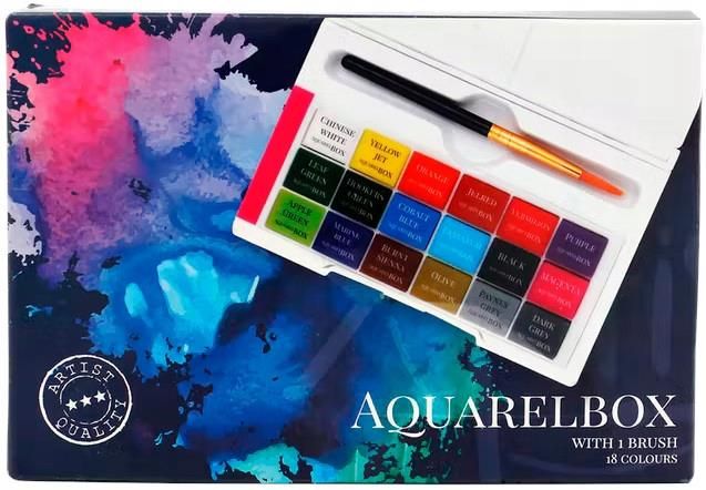 Zestaw farb akwarelowych w plastikowym pudełku Creative Artist Skład zestawu: 18 farb akwarelowych 1 pędzelek plastikowe pudełko o wymiarach: rozłożone 12cm x 15,5cm, złożone 12cm x 8cm Komplet 18 farb akwarelowych w kostkach w plastikowym pudełku, które pełni funkcje paletki do mieszania farb. W …