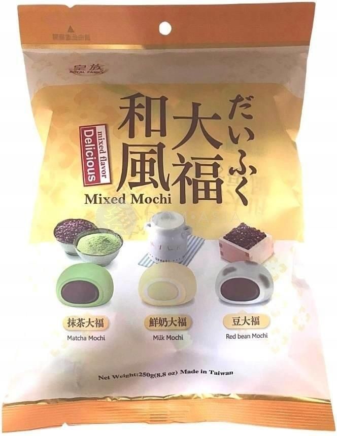Paczuszka przepysznych, azjatyckich słodyczy marki Royal Family! Miks ciasteczek mochi Marshmallow Daifuku w trzech smakowitych odsłonach: mochi z białego ciasta ryżowego z nadzieniem z orzeszków ziemnych; mochi z zielonego ciasta z dodatkiem zielonej herbaty matcha i nadzieniem anko; mochi z …