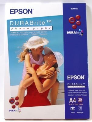 Epson Photo paper A4, 200g/ m2 - 20 arkuszy C13S041732 Nowy papier fotograficzny DURABrite Photo Paper A4 do drukarek Epson C70/80/82/CX5200, a także do nowych drukarek C64/C84! Papier ma lekko błyszczącą powierzchnię, jest wodoodporny, a tusz się na nim nie rozmazuje.   Rozmiar papieru: DIN A4 Gramatura papieru: 200 g Liczba arkuszy: 20
