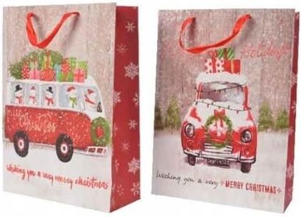 Świąteczna torba prezentowa Świąteczna torba prezentowa wykończona uchwytem z wstążki. Idealnie sprawdzi się do szybkiego i efektywnego pakowania prezentów. Pięknie będzie się prezentować pod choinką. Parametry: wysokość: 42 cm szerokość: 30 cm kolor: czerwony, biały motyw: auto, autobus głębokość: 12 cm oferta dotyczy 1 sztuki Produkt dostępny w kilku wzorach. Wydawany losowy wzór - dostępny w magazynie.