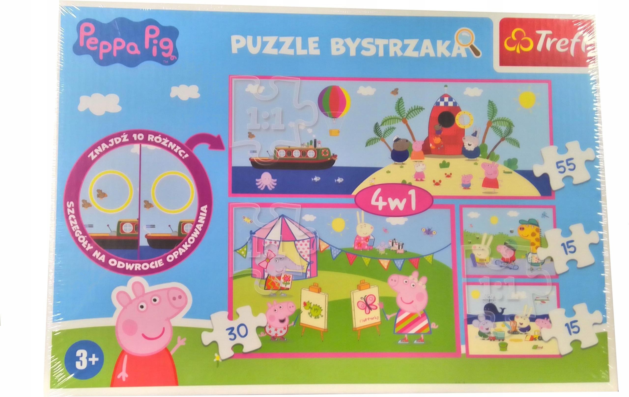 Trefl Puzzle Bystrzaka 4W1 Peppa Pig 91801 Puzzle bystrzaka o motywie bohaterów bajki PEPPA PIG to zestaw czterech, pełnych wyzwań, układanek dla dzieci. Poziom trudności wzrasta wraz ze zwiększającą się liczbą elementów. Na układance o największej liczbie puzzli kryje się 10 szczegółów, których nie widać na tym samym obrazku na opakowaniu. Wiemy, jak ważne jest bezpieczeństwo Twojego dziecka. Dokładamy wszelkich starań, aby nasze puzzle były nie tylko atrakcyjne i stymulujące rozwój na każdym etapie jego edukacji, lecz także spełniały najwyższe normy bezpieczeństwa.  Układanie puzzli niesie za sobą wiele korzyści. To skuteczny sposób na ćwiczenie pamięci, koncentracji, a także logicznego myślenia. Puzzle uczą również cierpliwości, rozwijając tym samym kreatywność i wyobraźnię przestrzenną. Wspierają dodatkowo rozwój zdolności manualnych dziecka. Układając poszczególne elementy, trenuje precyzję ruchów i koordynację oko-ręka.