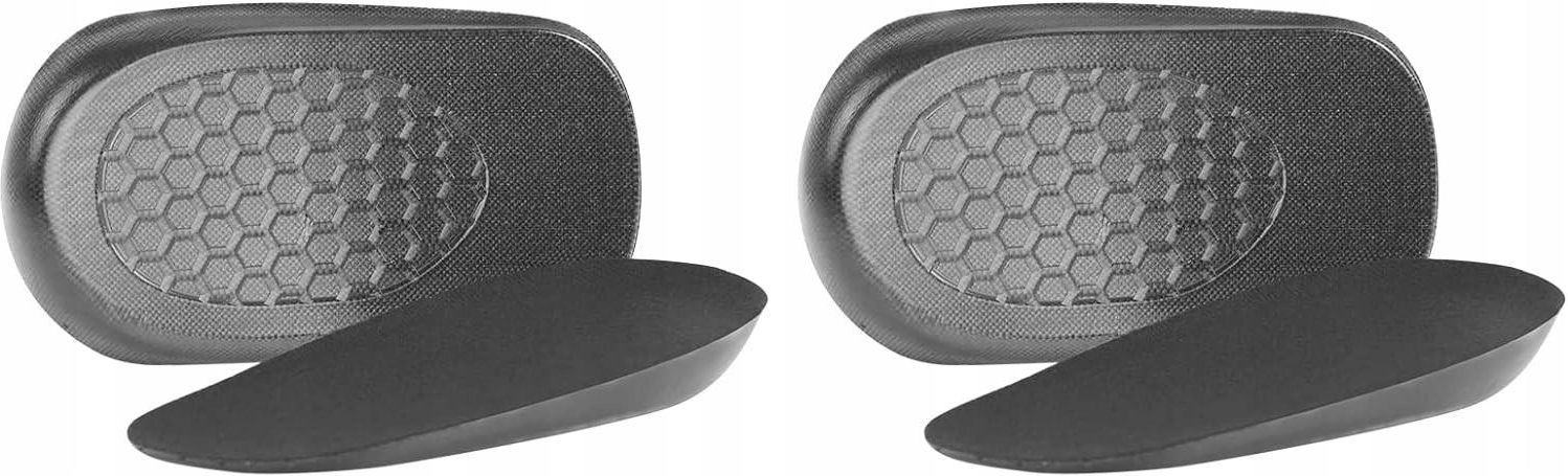 2 pary wygodnych, żelowych wkładek do obuwia amortyzujących pięty i podnoszących sylwetkę. Rozmiar L, w szczególności polecany panom. Prosimy o zapoznanie się z wymiarami na zdjęciu poniżej. Wysokość podpiętka 1.5 cm. Wyposażone w lepki spód o strukturze plastra miodu, który zapobiega ślizganiu się wkładki wewnątrz buta. Wkładki można prać w pralce. Wspomagają stawy i mięśnie oraz pomagają złagodzić ból spowodowany nierówną długością nóg lub zapaleniem ścięgna Achillesa. Zestaw obejmuje 2 pary.