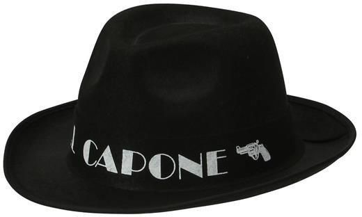 KAPELUSZ CZARNY GANGSTER AL CAPONE Kapelusz wykonany z materiału w kolorze czarnym. Obszyty zdobieniem w postaci czarnej tasiemki z napisem Al Capone i pistoletem. Obwód kapelusz - ok. 57 cm. Kapelusz może stanowić samodzielny element, albo być uzupełnieniem stroju Gangstera na bal przebierańców. …