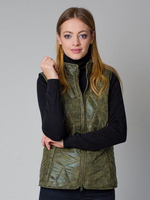 Kamizelka pikowana damska Kamizelka damska z watowaniem, stylowym pikowaniem i stójką. Zapinana na zamek, posiada dwie kieszenie. Kolor: zielona w drobny wzór Zapięcie: zamek błyskawiczny Kieszeń: wpuszczane na zamek Skład: 100% poliester Jakość: pierwsza Gwarancja: 24 m-ce Producent: Willsoor Uszyto w Polsce