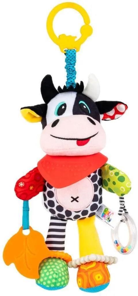 BALIBAZOO KROWA KLARA ZABAWKA SENSORYCZNA ZAWIESZKA 82315 Z zawieszką w kształcie krówki każdy spacer zamieni się w wesołą przygodę! Zabawka wyposażona jest w obręcz pełną grzechoczących kuleczek i dwa miękkie gryzaki, które przynoszą ulgę podczas ząbkowania. Jeden z nich ma kształt listka i doczepiony jest do łapki zwierzaka, drugi ma kształt bandany z wypustkami, która zdobi krowią szyję. Pluszak został wykonany z materiałów różniących się kolorem, wzorem i fakturą, przez co stymulować będzie malucha do sensorycznego odkrywania świata i rozwijania zdolności poznawczych. Zabawka posiada praktyczną zawieszkę, dzięki czemu można ją przymocować w dowolnym miejscu, aby mogła wszędzie towarzyszyć bobasowi. Produkt przeznaczony jest dla dzieci od dnia narodzin. Cechy produktu: doczepiona grzechotka; doczepione gryzaczki; zróżnicowane faktury materiału; wiek: 0m+ Zabawka przeznaczona dla dzieci od pierwszych dni życia. Wielkość pluszowej zabawki (bez uchwytów): ok. 27cm