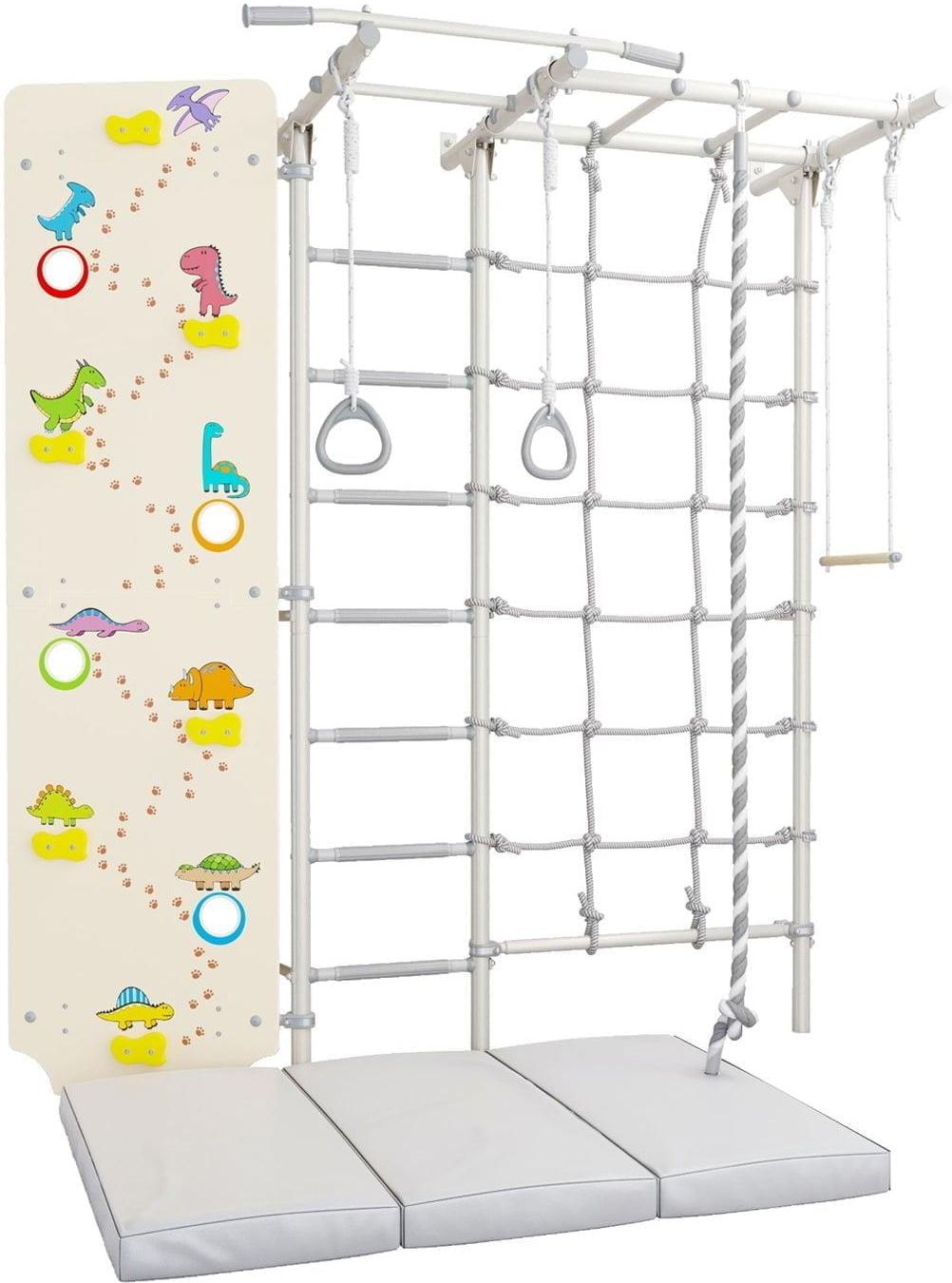 Drabinka gimnastyczna z drążkiem Next 5 Dino Drabinka gimnastyczna dla dziecka Next-5 Dino jest bardzo rozbudowanym przyściennym zestawem, w którym oprócz klasycznej metalowej drabinki do pokoju, znajdziemy również siatkę i ściankę wspinaczkową. Drabinka Next 5 Dino została wykonana z wysokiej jakości i trwałych materiałów, które zapewniają bezpieczeństwo podczas zabawy i treningu. Konstrukcja opiera się na solidnej ramie metalowej, która jest wytrzymała i stabilna, co pozwala na swobodne wspinanie się i eksplorowanie różnych możliwości ruchowych. ELEMENTY ZESTAWU metalowa drabinka gimnastyczna drabinka pozioma drążek nieprzesuwny kółka gimnastyczne lina gimnastyczna huśtawka gimnastyczna (trapez) słupek z pajęczyną ścianka wspinaczkowa Dino materac Kometa 150x100x10 trzyczęściowy WAZNE Zestaw przeznaczony dla dzieci od 3 lat i dorosłych Dopuszczalne obciążenie drabinki z drążkiem: 100 kg Dopuszczalne obciążenie akcesoriów i siatki: 50 kg Szerokość zestawu: 192 сm Szerokość drabinki: 49 cm Wysokość zestawu: 220 cm Głębokość całkowita: 86 cm Wymiary materacu: 150x100x10 cm (3-częściowy) Montaż: przyścienny Kolor drabinki: biały Kolor materacu: szary Zalecenia producenta: dzieci od 3 do 7 lat powinny ćwiczyć tylko pod nadzorem rodziców
