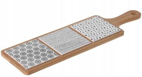 Parametry: Materiał wykonania: Drewno Kolor: Biało-czarno-jasno brązowy Długość: 44 cm Szerokość: 12 cm Zastosowanie: Deska do serwowania przekąsek, ozdoba Cena dotyczy jednej sztuki