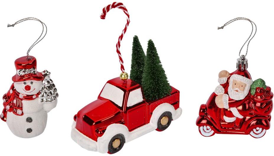 Ozdoby choinkowe w postaci bałwana, samochodu i mikołaja. Wykonane z tworzywa.